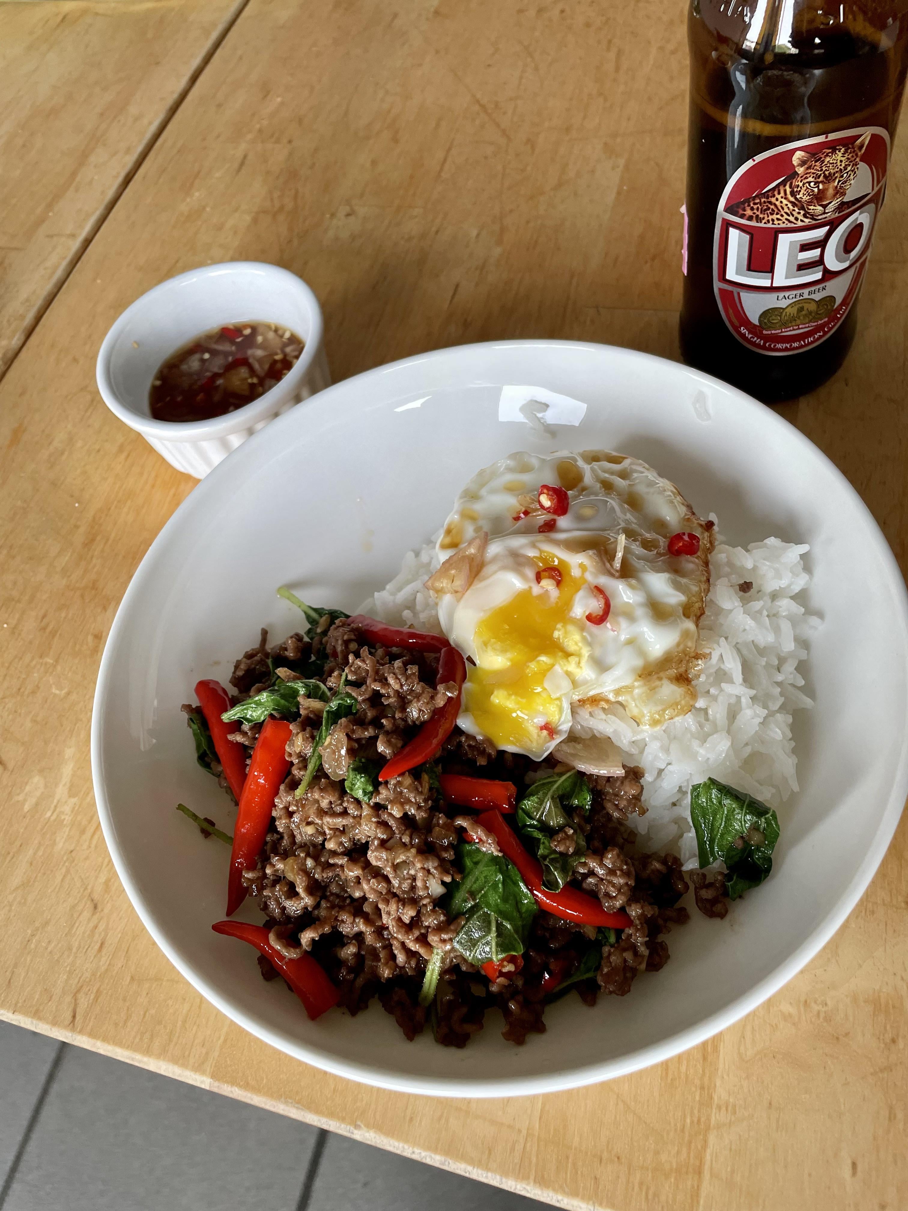 Most popular dish in Thailand, eaten best very spicy. Basically a chilli paste with shallots and garlic made in a mortar, then fried and added the meat. You can use Beef, Chicken, Seafood and Tofu as well added then Oyster sauce, Fish sauce and dark soy sauce. Toss in some more whole chillies for extra spice and most important Holy Basil and the very end. Holy Basil is different from Italian Basil and Thai Basil, if you can’t find it Italian Basil fits better then Thai basil. Deep fried an egg as well and for the egg sauce I used Fish Sauce, shallots, chillies and Lime juice. It was so delicious just like I ate in Thailand ☺️