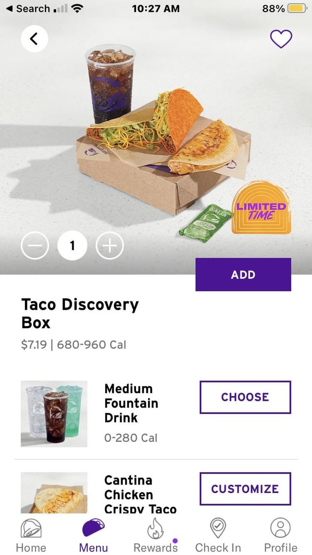 open the app, get ad for $5 taco discovery box, click order now, price is $7.19 😐 and im in a lower than average market normally
