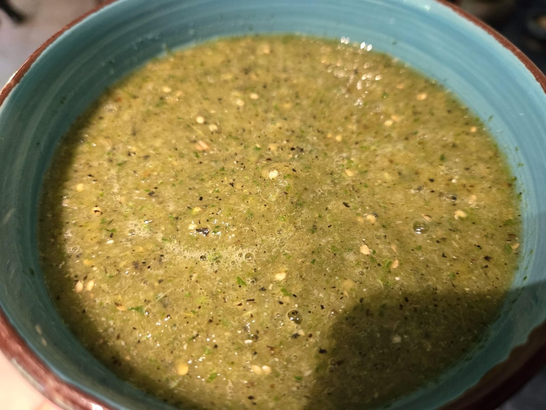 4 tomatillos; 1 large jalapeño; 1/4 white onion; 2 cloves garlic (all roasted under a broiler). A little handful of cilantro and a splash of water. Blend, then salt until satisfied.