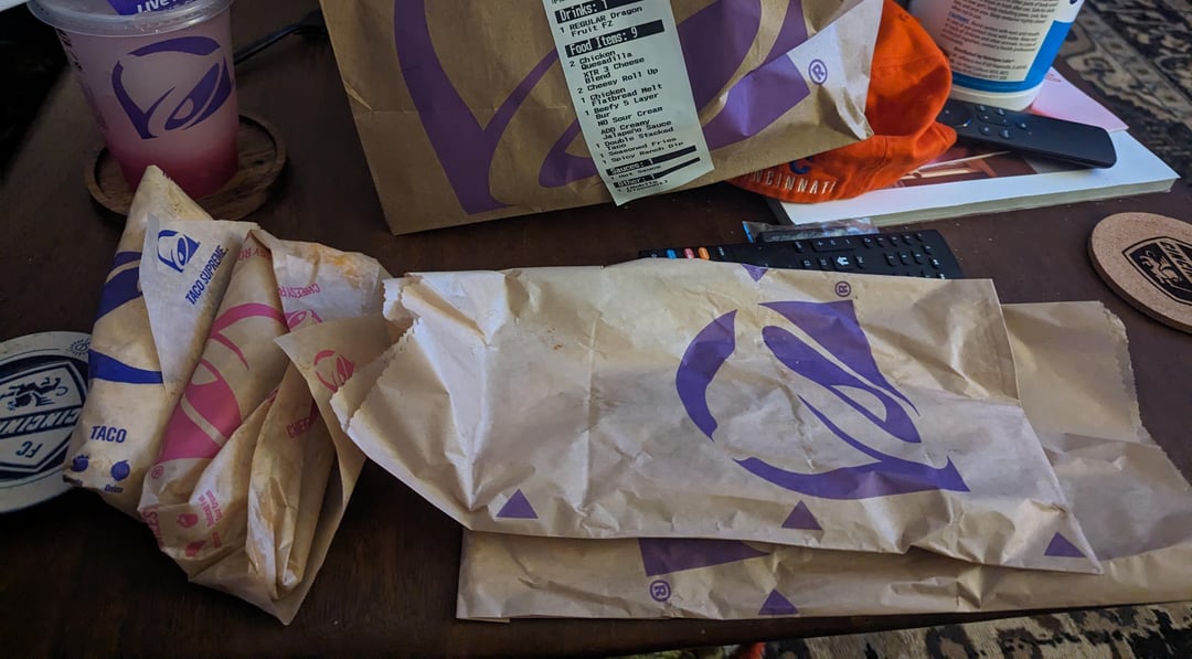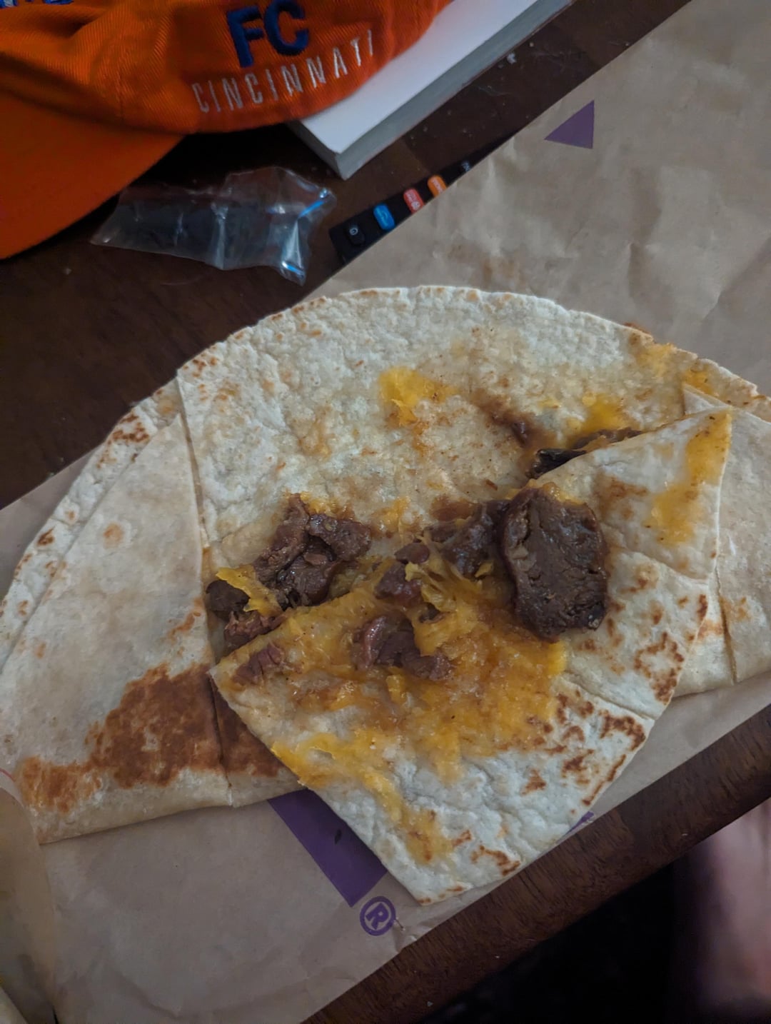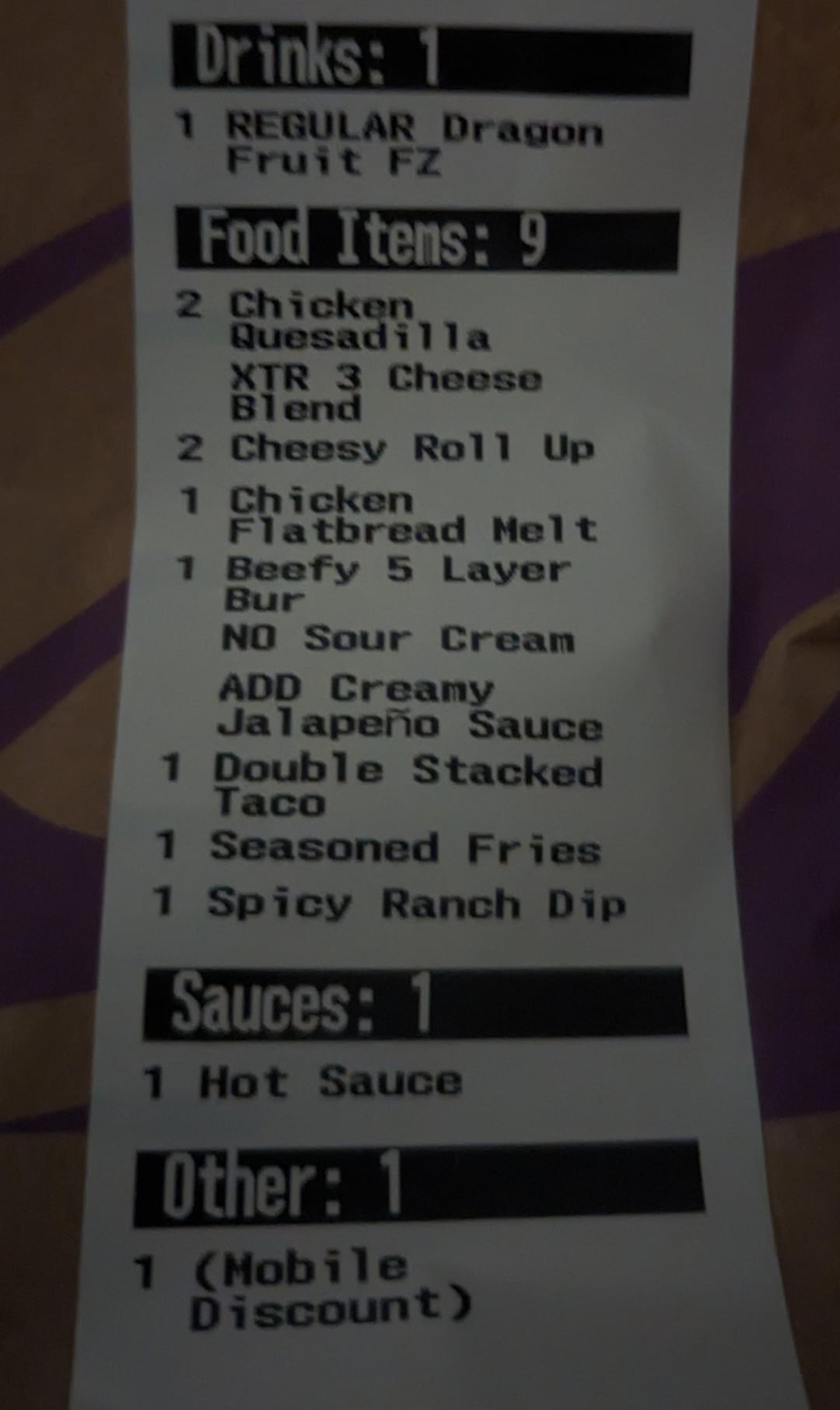 I ordered 9 food items and 1 drink for delivery from my local TB. I received 4 food items in total and my one drink. The four items? Two steak quesadillas and two beef soft tacos.