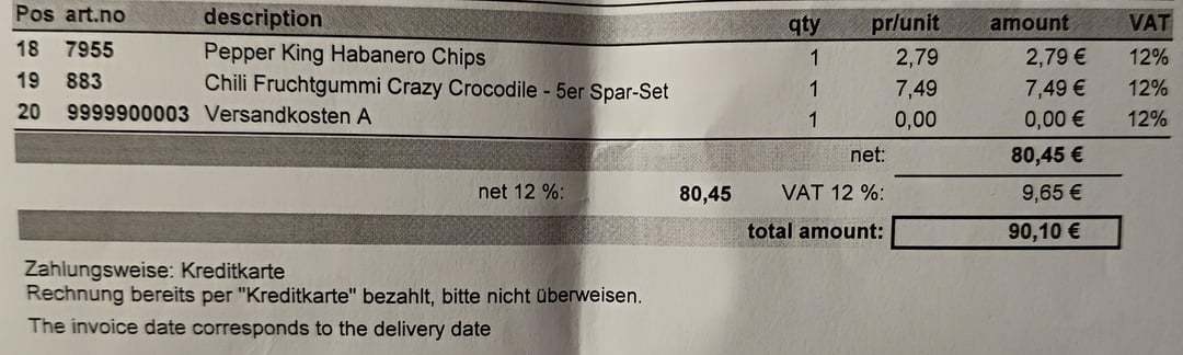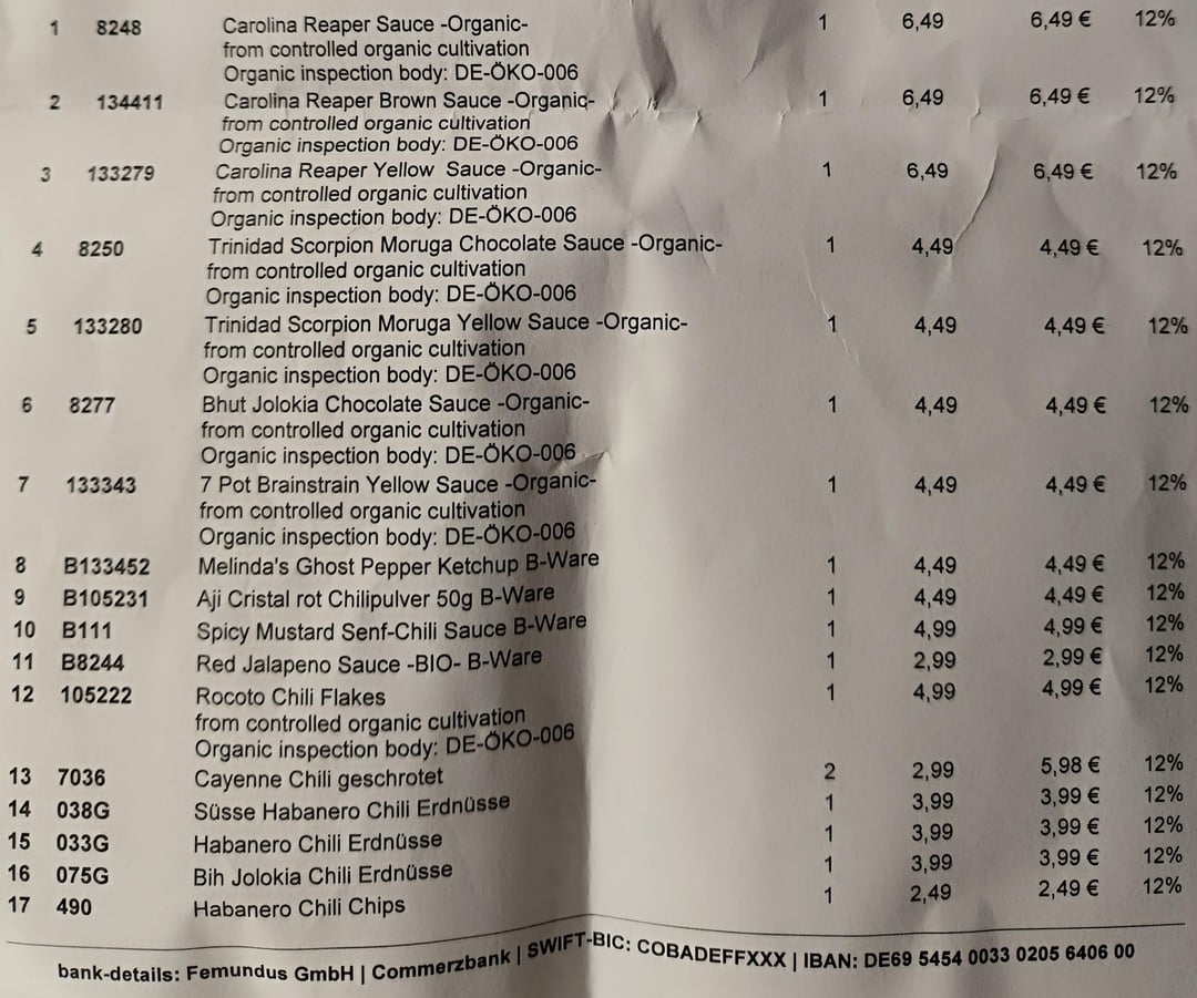 I paid €90 for the total package (shipping included), except for the Chile Arbol dried chilis, which cost €5 for two packages, 200g total. Packaging was perfect. No damage or anything. Hard paper and air bubble wrap was used for each item. Sent with DHL.