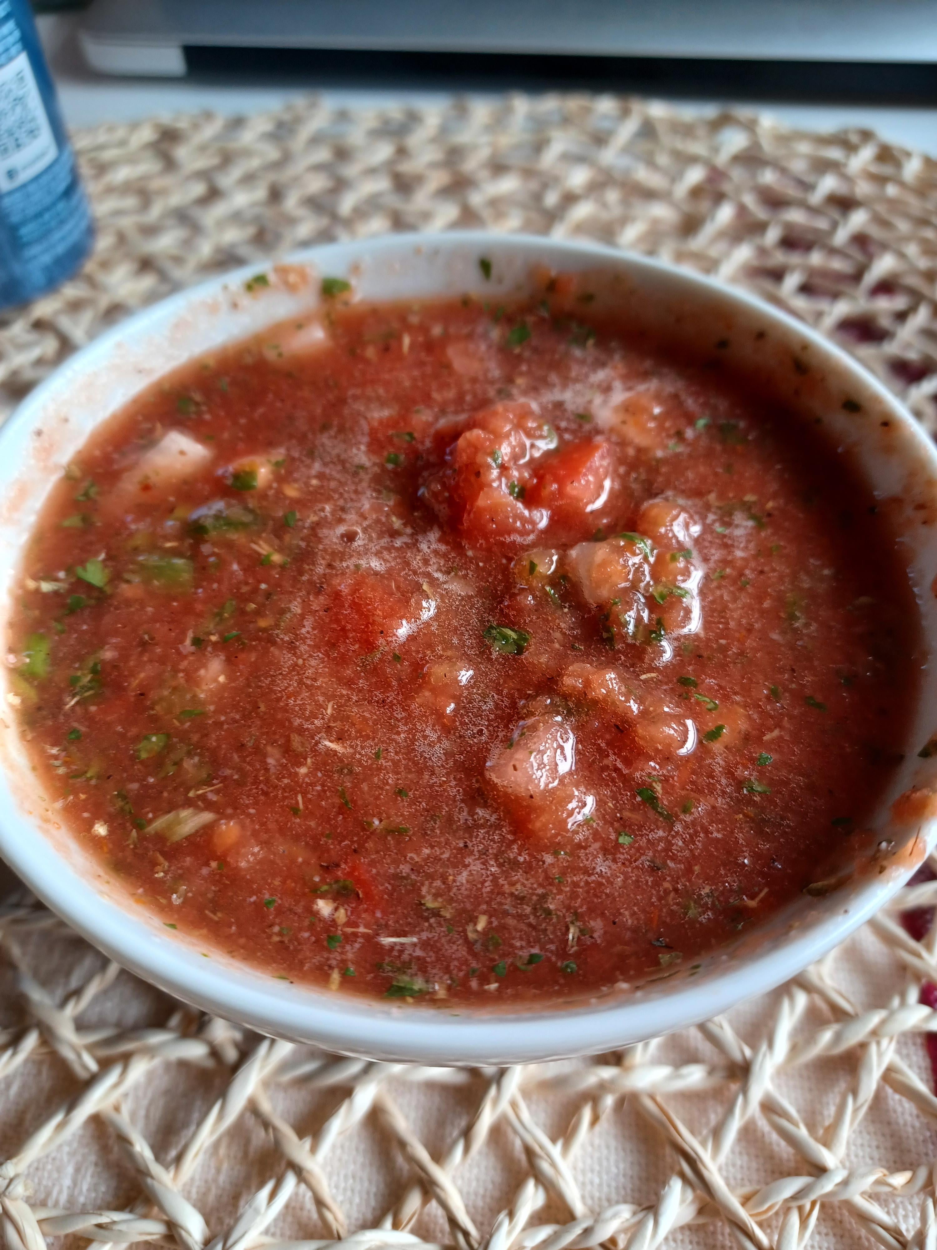 This is very easy and quick to make. The counterintuitive key here is that the majority of the salsa is actually just pureed canned tomatoes or tomato sauce. If you cut up too many veggies it makes the sauce too thick and it's not like restaurant salsa.