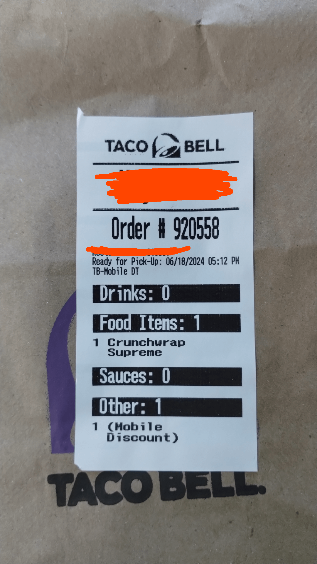 I didn't arrive at the restaurant until 5:25. I thought they were supposed to wait until you got there? I'm planning on saving this crunch wrap for tomorrow and heating it up in the oven, so it's not as big of a deal, but usually I eat it right away, so I'm still kind of frustrated. taco bell tastes best fresh, and I was expecting the order to be made when I got there, not before. and yes, I did select drive thru, not in-store.