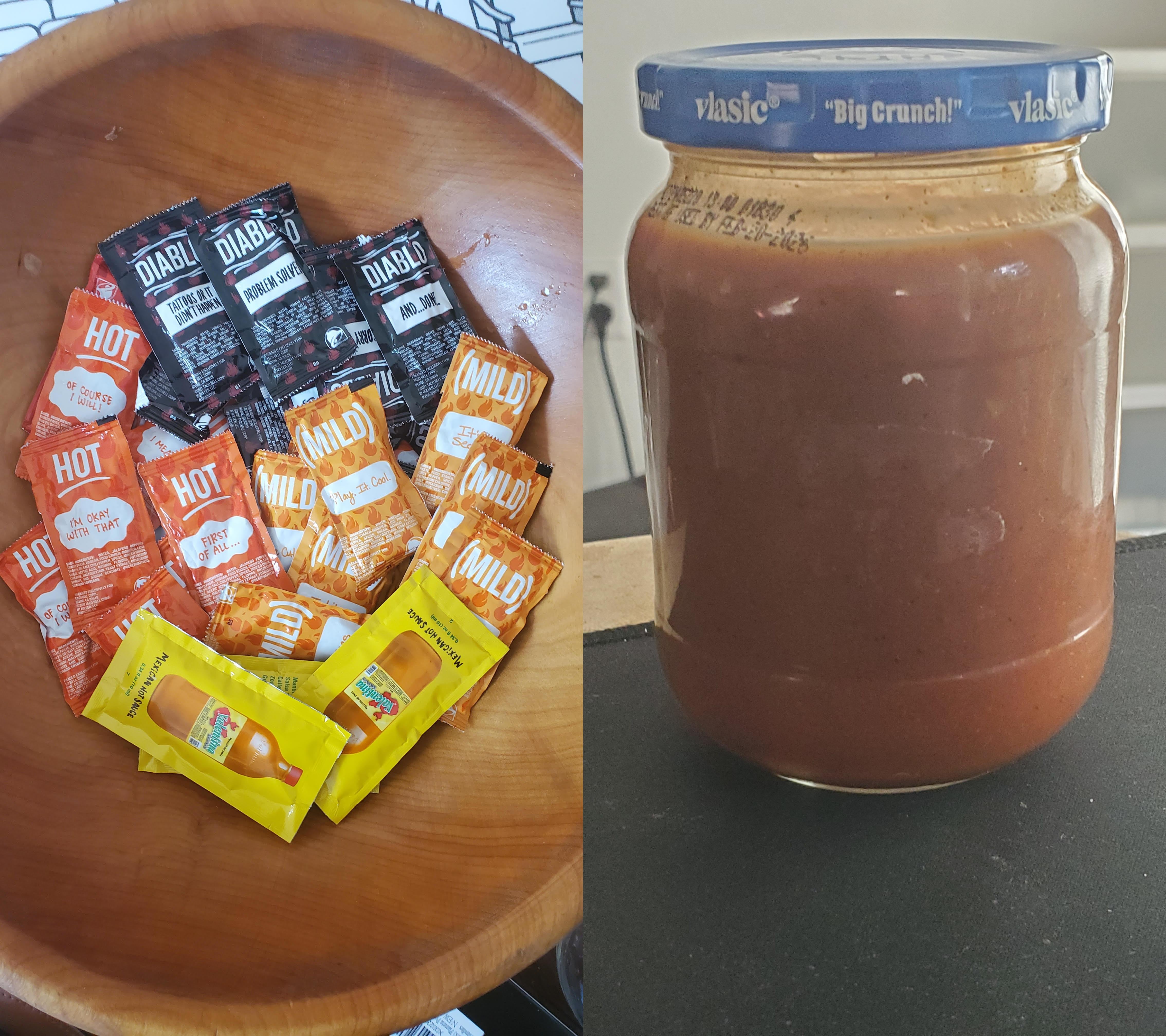I ran out of hot sauce in the house, and needed something for the burrito I made. All i had was a drawer full of Taco Bell packets. I decided to squeeze all 59 packets I have saved into a jar- instant hot sauce.