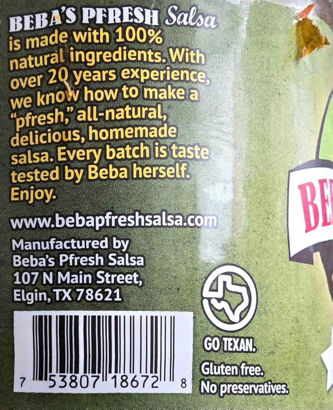 Beba’s Phresh Salsa is killer! I found this at Fiesta Tortilla Factory in Austin, but its available at all Central Markets. I didn’t notice the “Arbol” sticker until after I got home. I hope they offer this one again.