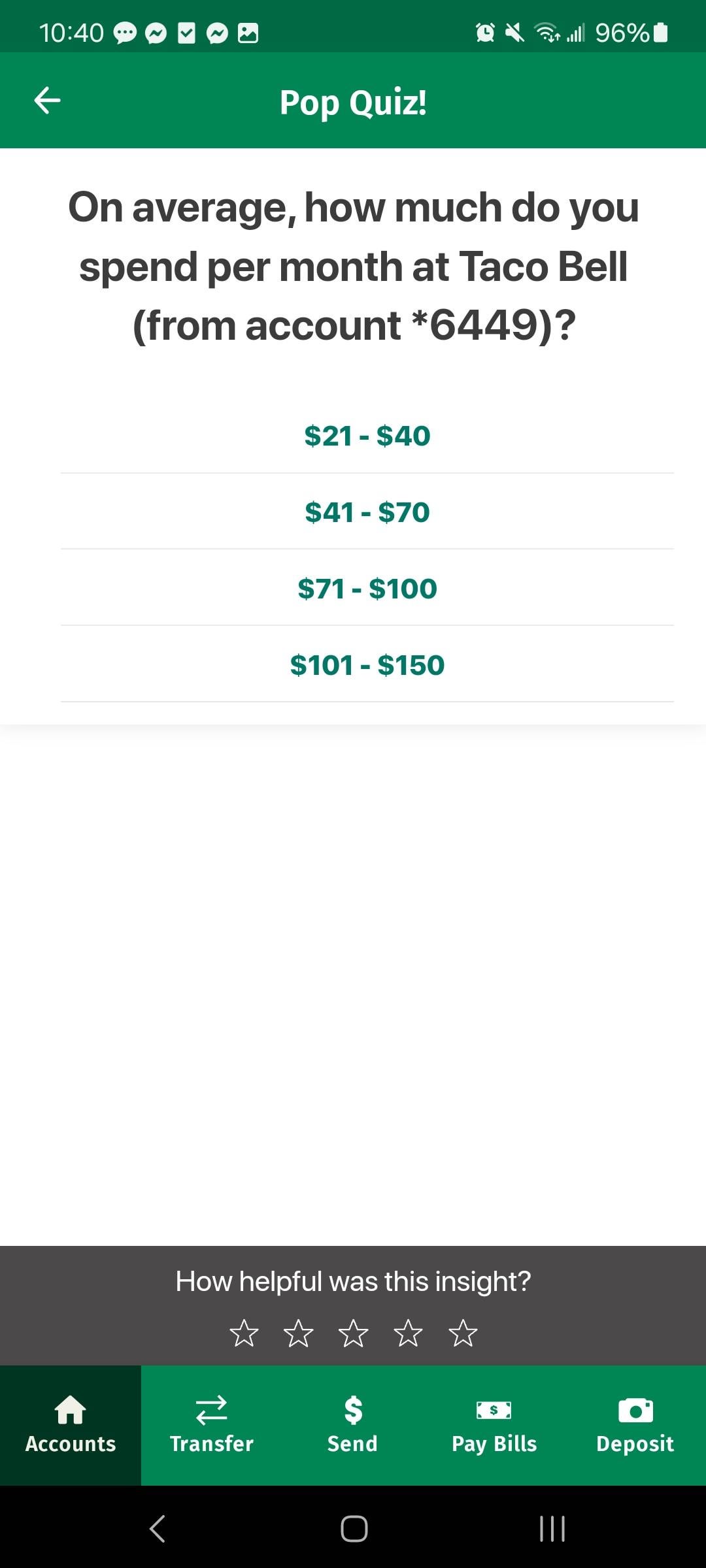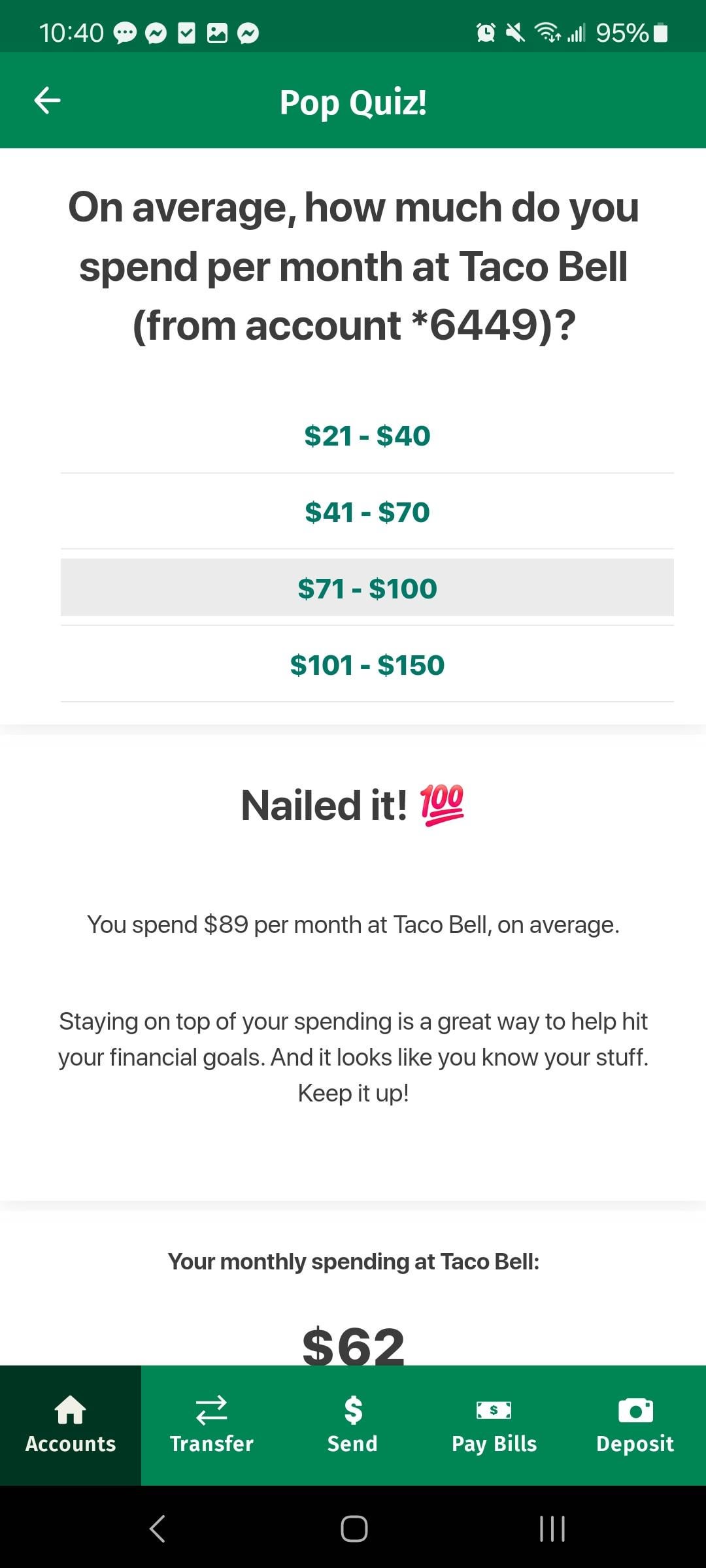 I was on my bank app and it asked if I wanted to take a quiz on my Taco Bell spending. Granted I do a lot of "I buy, you fly" transactions but I would say at least 70% is me. Dang.by burritos0504 taco bellWrite A CommentYou must be logged in to post a comment.