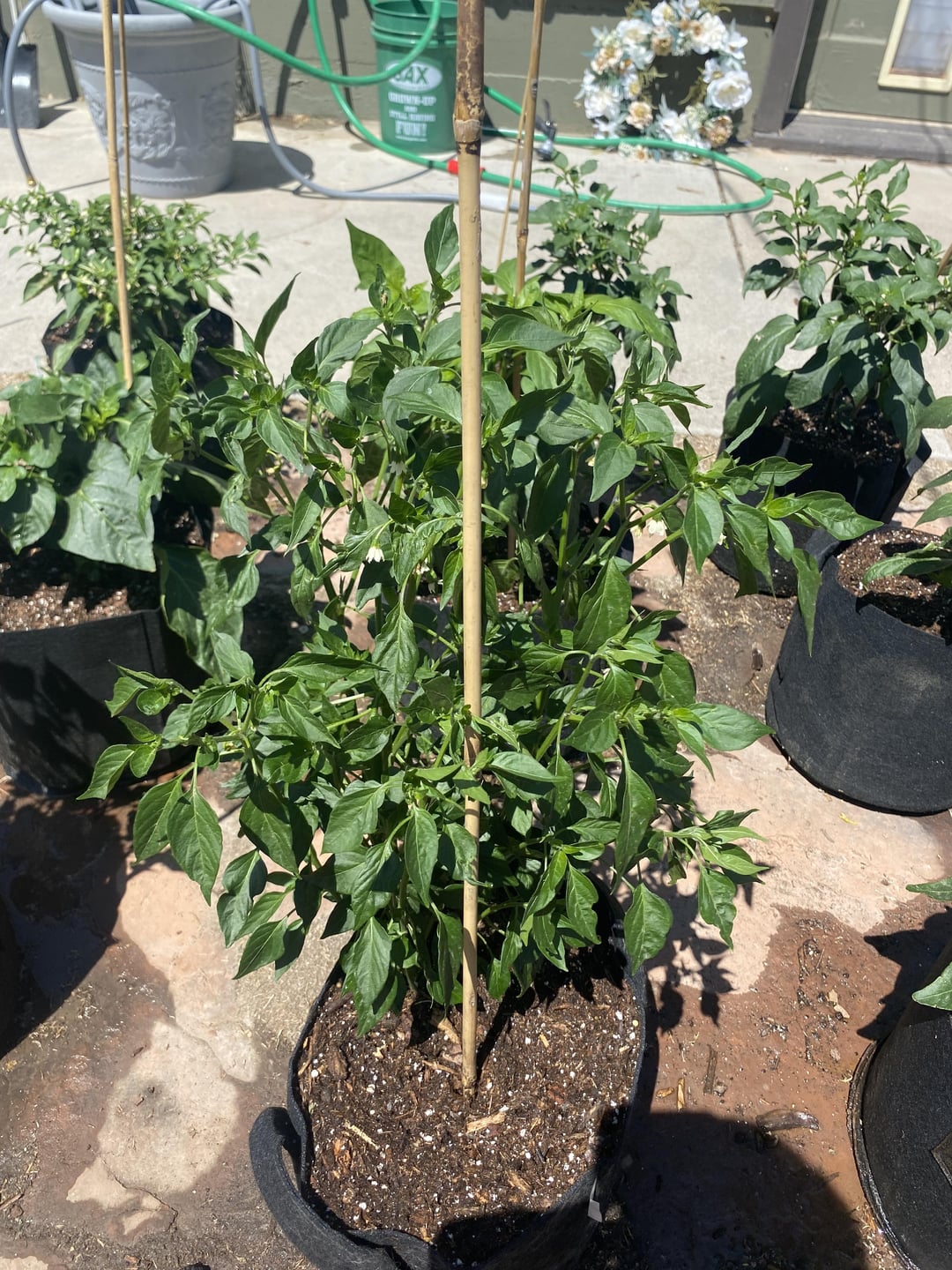 Pepper 3: Plant has grown very tall, the peppers are very long and skinny and green.