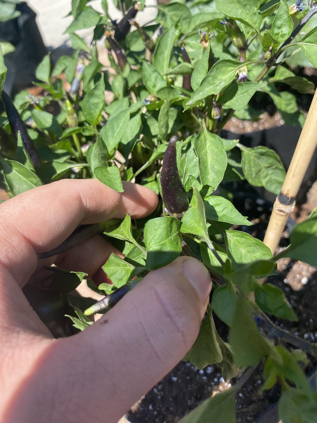 Pepper 1: Purple stem, dark green leaves, pepper itself is coming out purple and green