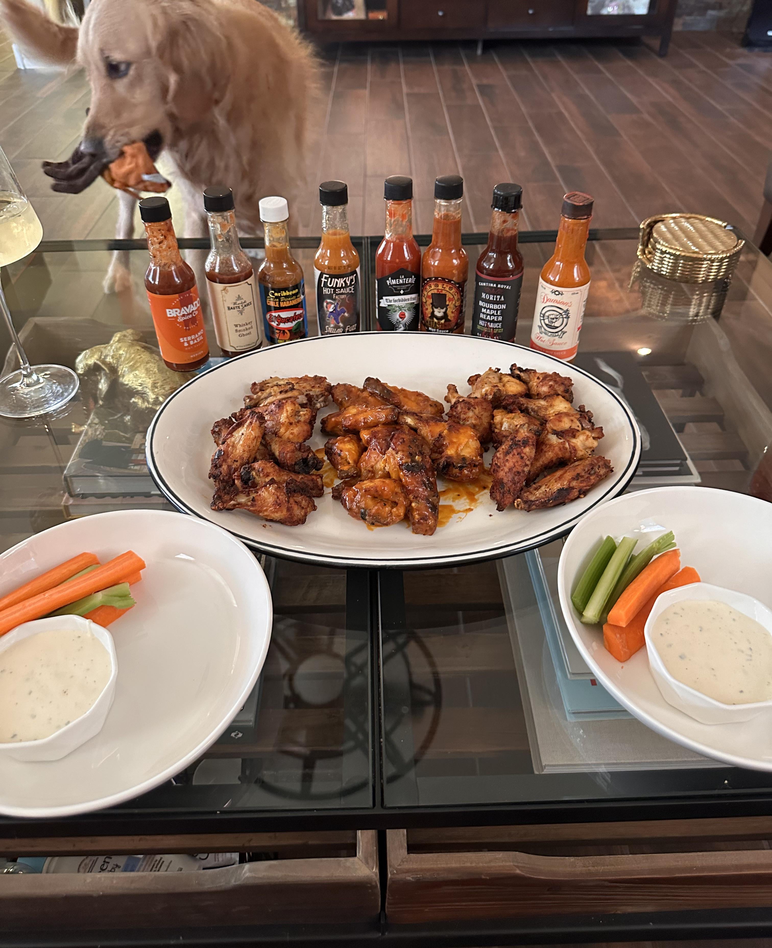 Some of my collection for wing taster night. Middle wings are sauced with combo of cattleman’s gold & franks. Dry franks airfryer seasoned for all the hot sauce tasters. Whiskey bbq hot sauce is my fav of the night.