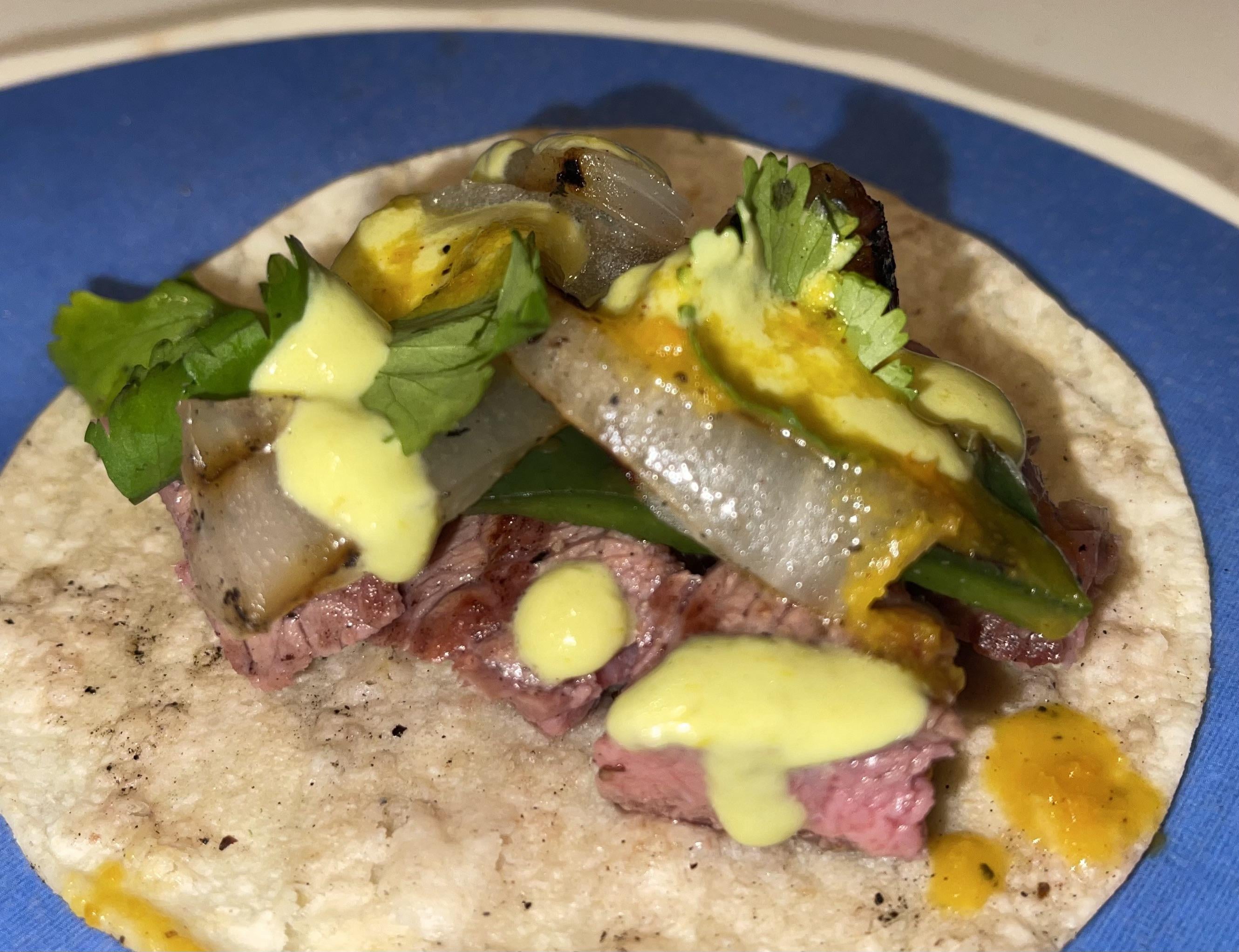 Grilled ribeyeGrilled onionGrilled poblano pepperCilantroJalapeño salsa Scotch bonnet pepper hot sauceLime juiceby Honkey_Fellatio Write A CommentYou must be logged in to post a comment.