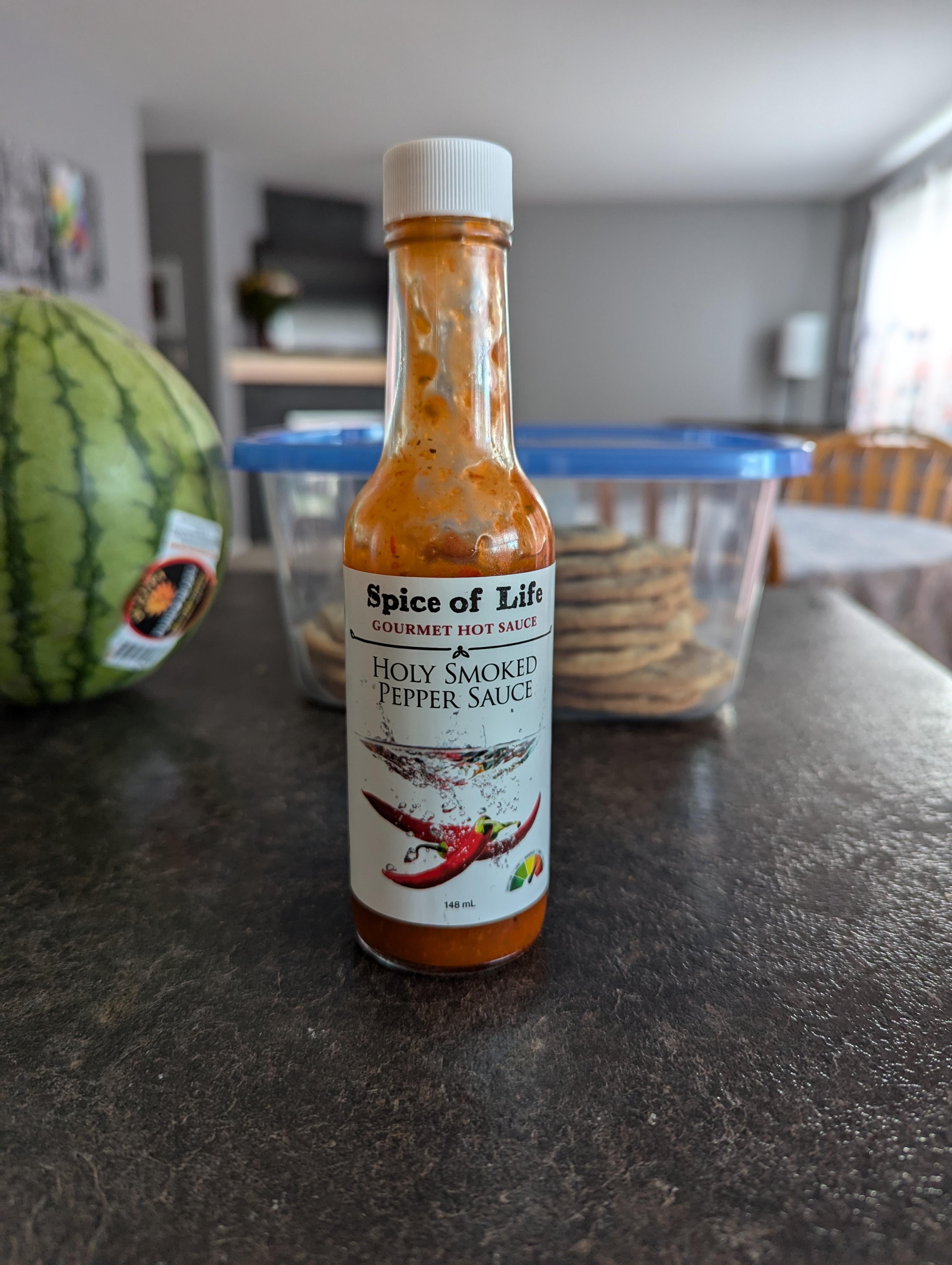 First off, spicy it is. Not outrageous, but good spicy. It's an Habanero-based sauce with bell peppers, vinegar, onion, cucumber, salt, and a bit of liquid smoke. It has its own distinct flavor profile that you can definitely taste when added to something.