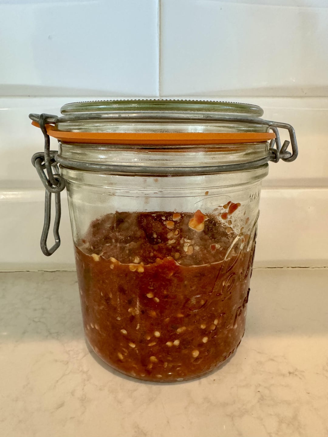 • 1lb/450g fresh peppers (in this case, mostly ripe Serrano plus a few misc garden peppers)