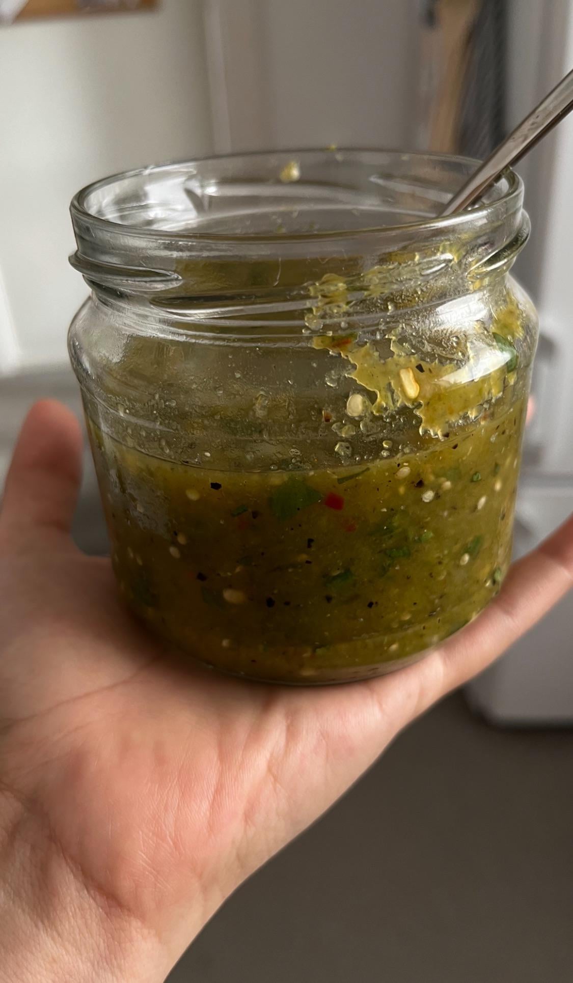 i can't buy fresh tomatillos at the market where i live now, so this salsa took four months to make. it's probably going to be gone by the end of the day by quax0 pico de gallosalsaSauce 3 Comments quax0 2 years ago in the food processor: roasted tomatillos, roasted serranos, chile de árbol, clove, bay leaf, cumin, saltchopped cilantro and white onion were mixed in at the end Dazzling-Hope8646 2 years ago 🙁 hope you enjoy it! Outrageous_Appeal292 2 years ago Nothing like growing it yourself!!!Write A CommentYou must be logged in to post a comment.
