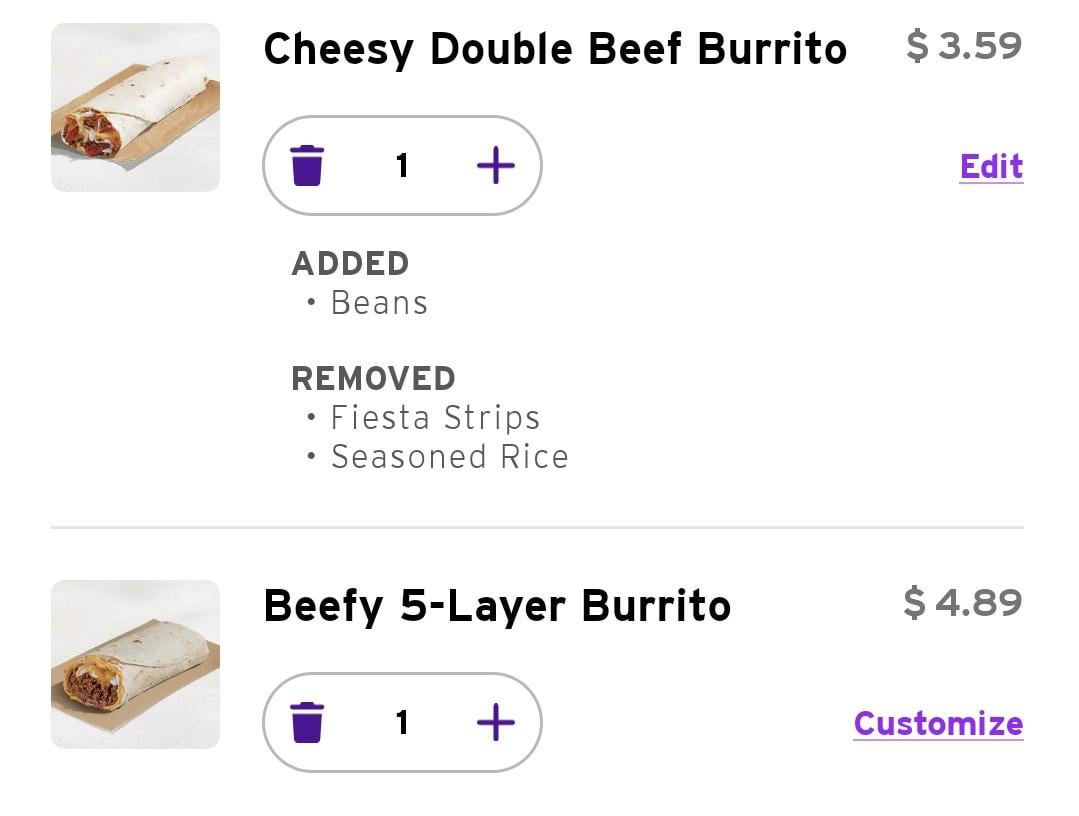 The beefy 5 layer is normally almost 5 dollars but with just a few changes the double beef burrito is almost $1.50 less with more stuff just add beansby Substantial-Yellow16 taco bellWrite A CommentYou must be logged in to post a comment.