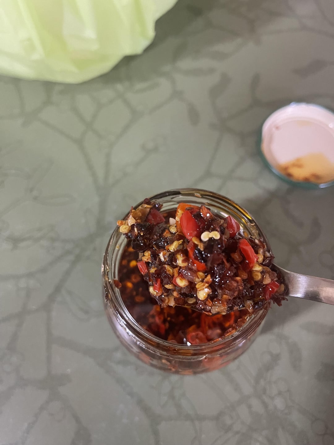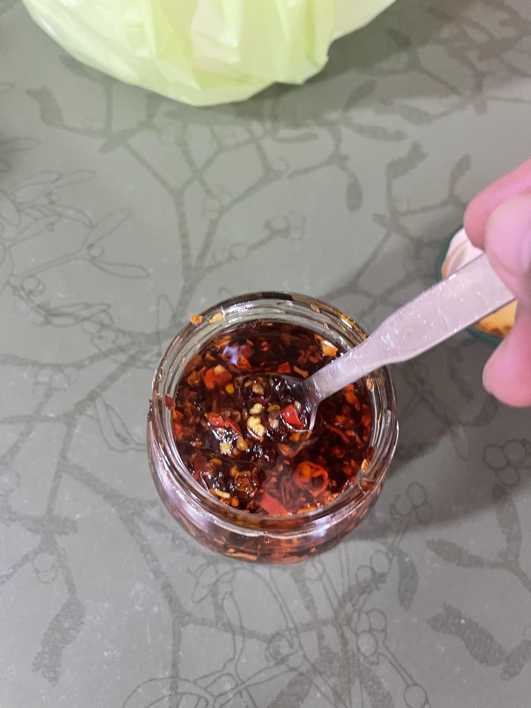 Take your mixture of chili flakes you've set apart before. Turn off the heat under the oil and pour your chili mixture in the oil. It's gonna fry for a bit, mix it well. Wait for it to cool and put it in a jar. Enjoy!