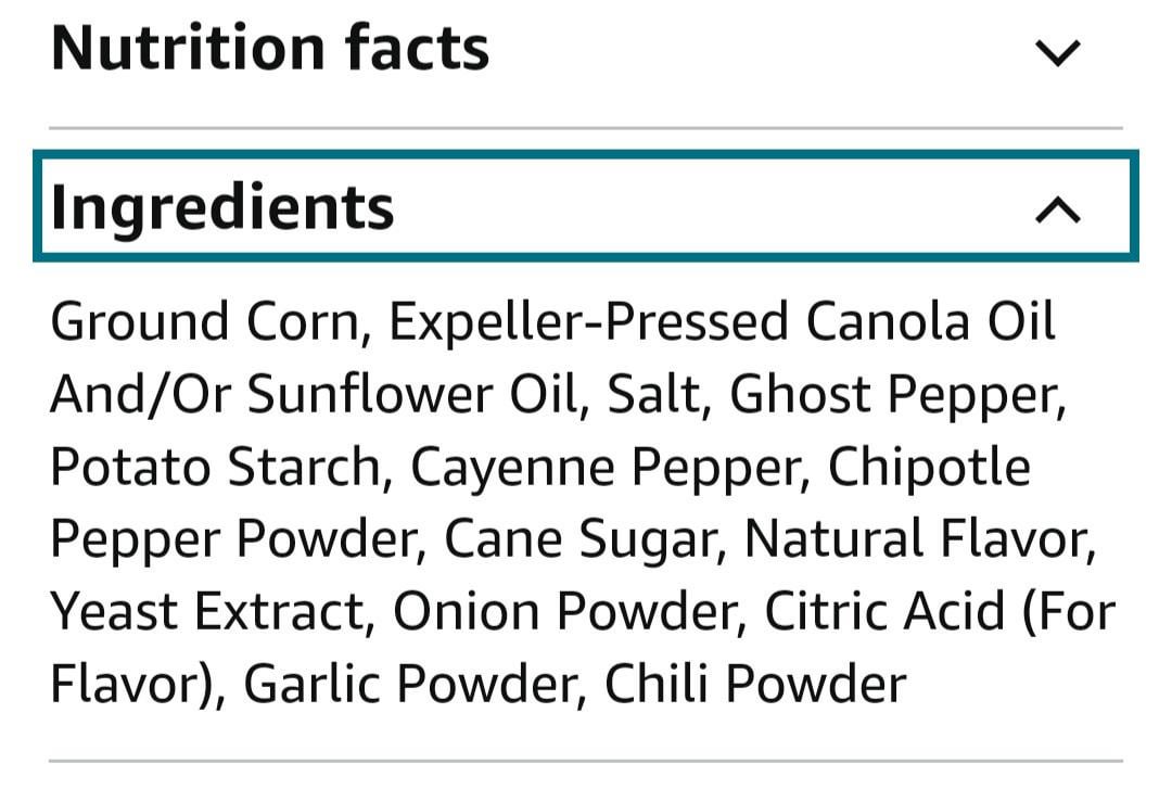 It depends on if you’re starting with salted chips or not. Salt would be the first ingredient if not, but assuming you start with regular salted but unflavored tortilla chips, I’d try something like 3 parts ghost powder, 2 parts chipotle, 1 part powdered sugar, plus a pinch of onion powder and a smaller pinch of garlic powder, and then iterate from there. It’ll probably come out hotter than theirs, so basically use chipotle as a filler to reduce heat if needed (the potato starch is probably there to add bulk to the seasoning blend, but I bet just using more mild chiles will be better for flavor). You may want to add additional salt, and superfine salt is going to work better than regular table salt (similar to the reason for using powdered sugar, fine grains stick better to chips). Also, if you want to replicate the yeast extract, I’ve got what amounts to a spicy yeast extract blended with superfine salt in this [Habanero Umami](https://heathotsauce.com/products/habanero-umami-seasoning) seasoning. Adding 1 part to the blend above would probably work nicely.