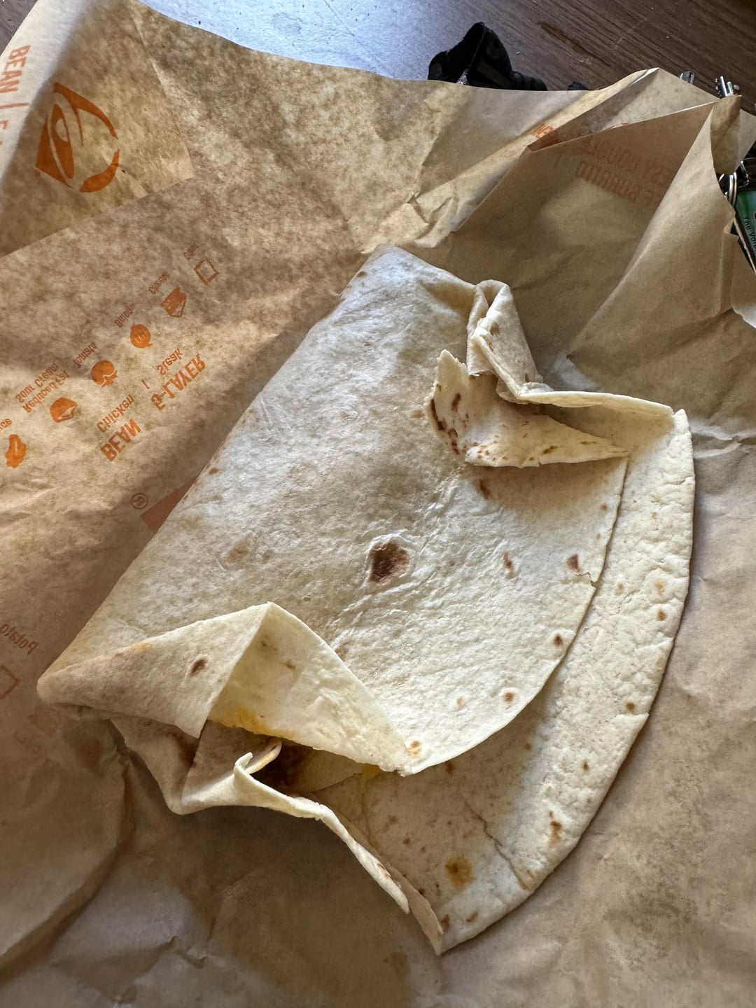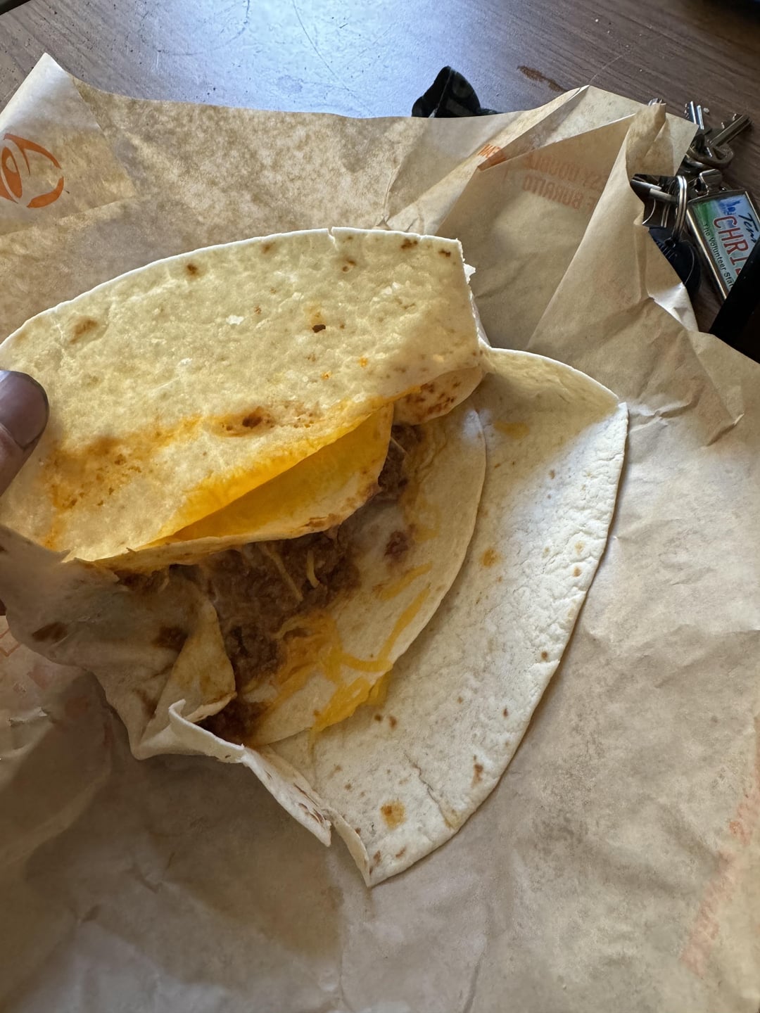 Ordered a Grilled Cheese Burrito box and this is the burrito they gave me. It has like a soft taco inside wrapped in a burrito shell. Obviously a mistake on the type of burrito and they forgot my cantina taco. Is this how regular burritos are made though with a shell inside? I can't recall ever seeing one like this.