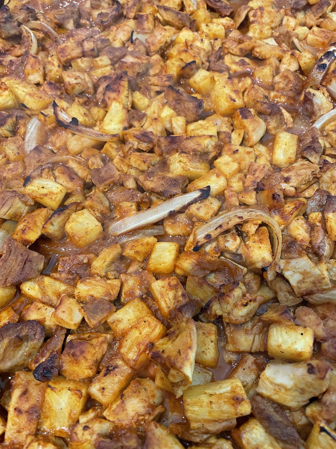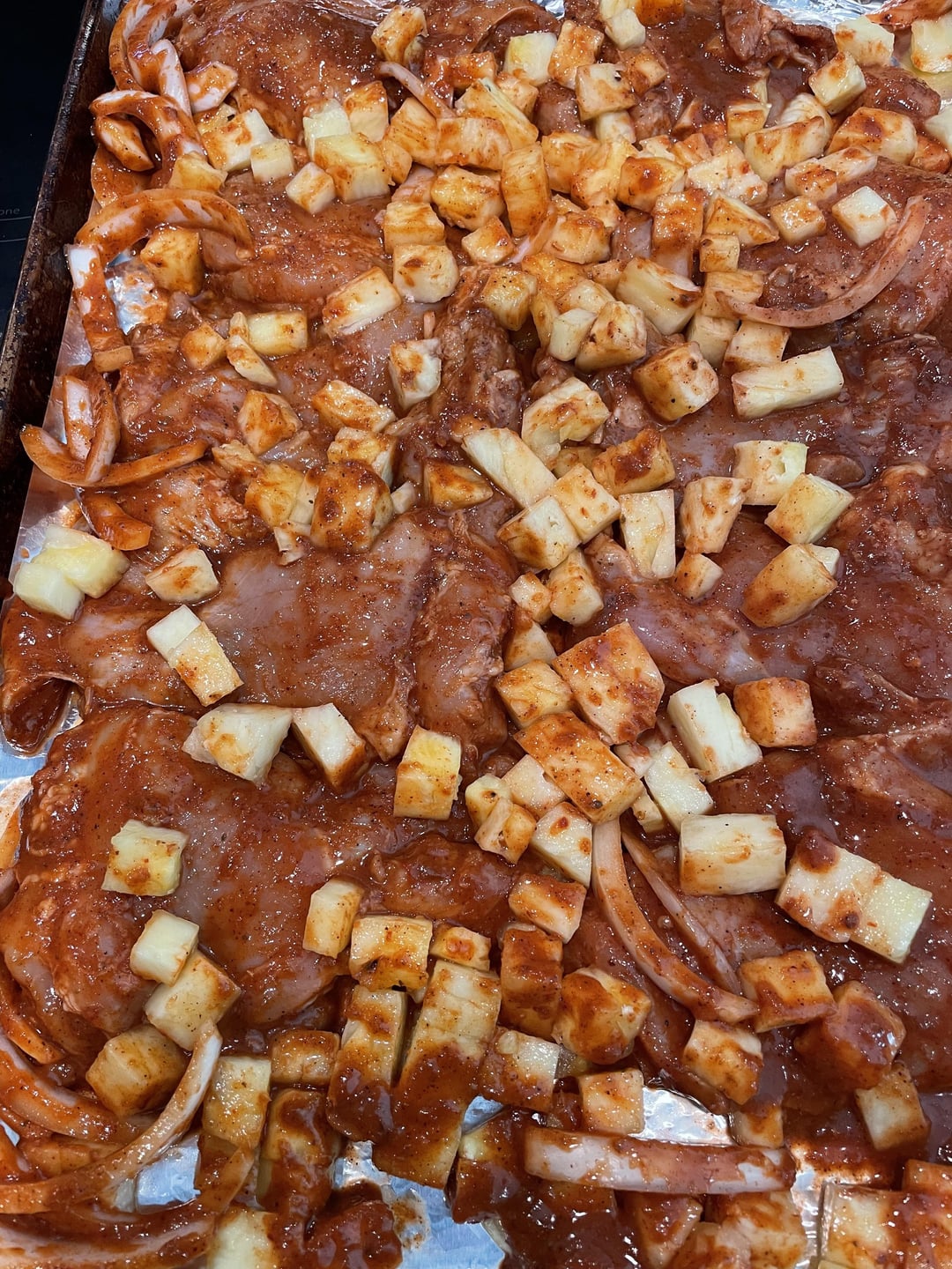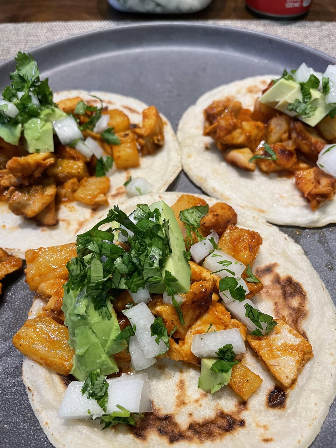 Used this recipe https://playswellwithbutter.com/chicken-al-pastor/ & doubled it for 3LBS of chicken thighs – added 1/4 piece of an onion and juice of 1 lime. Used Cooking Con Claudia’s tortilla recipe 😋