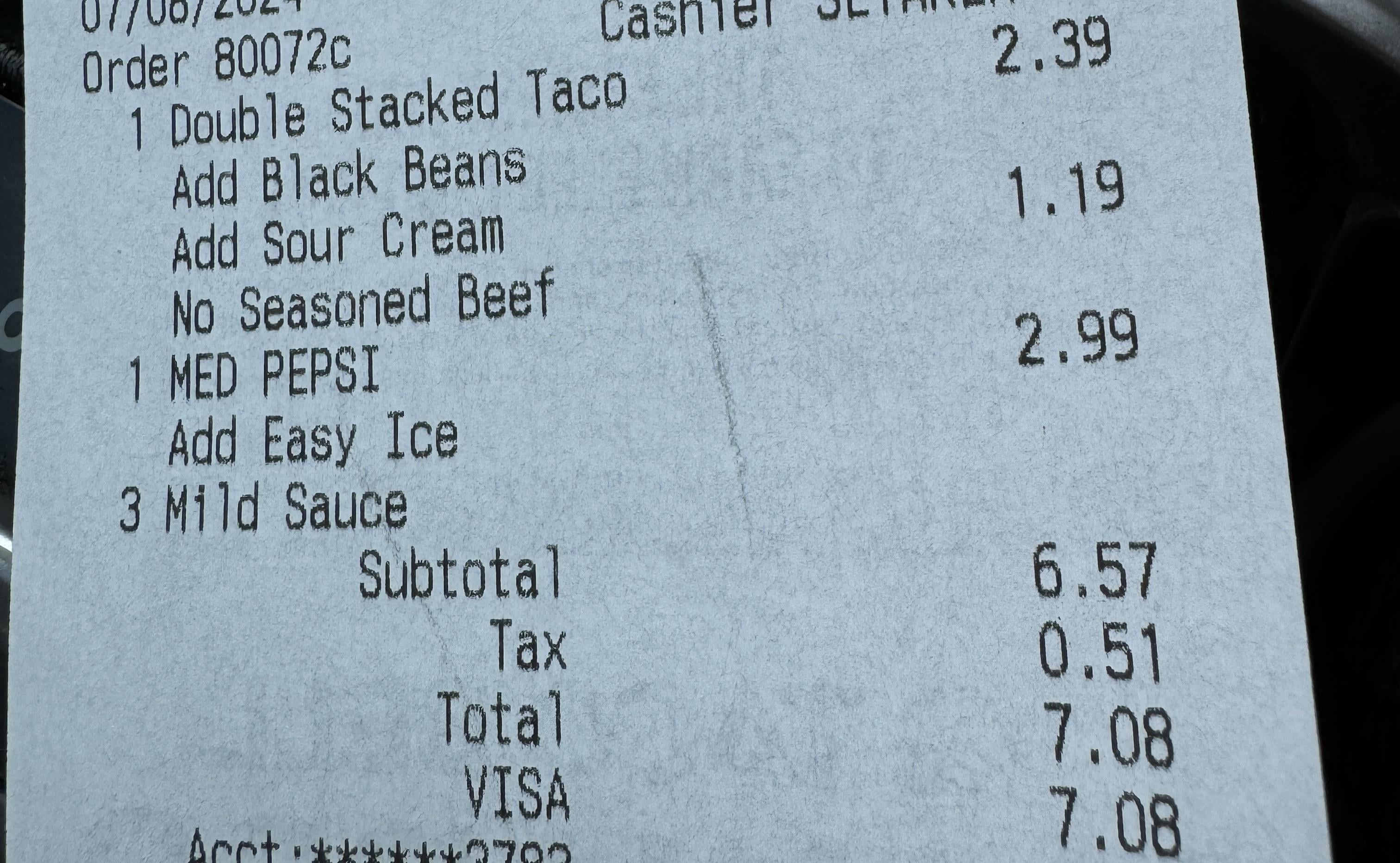 I think what blows my mind is that a little bit of sour cream on the taco is 50% of the price of the actual taco. $7 for a taco and drink is ridiculous imo