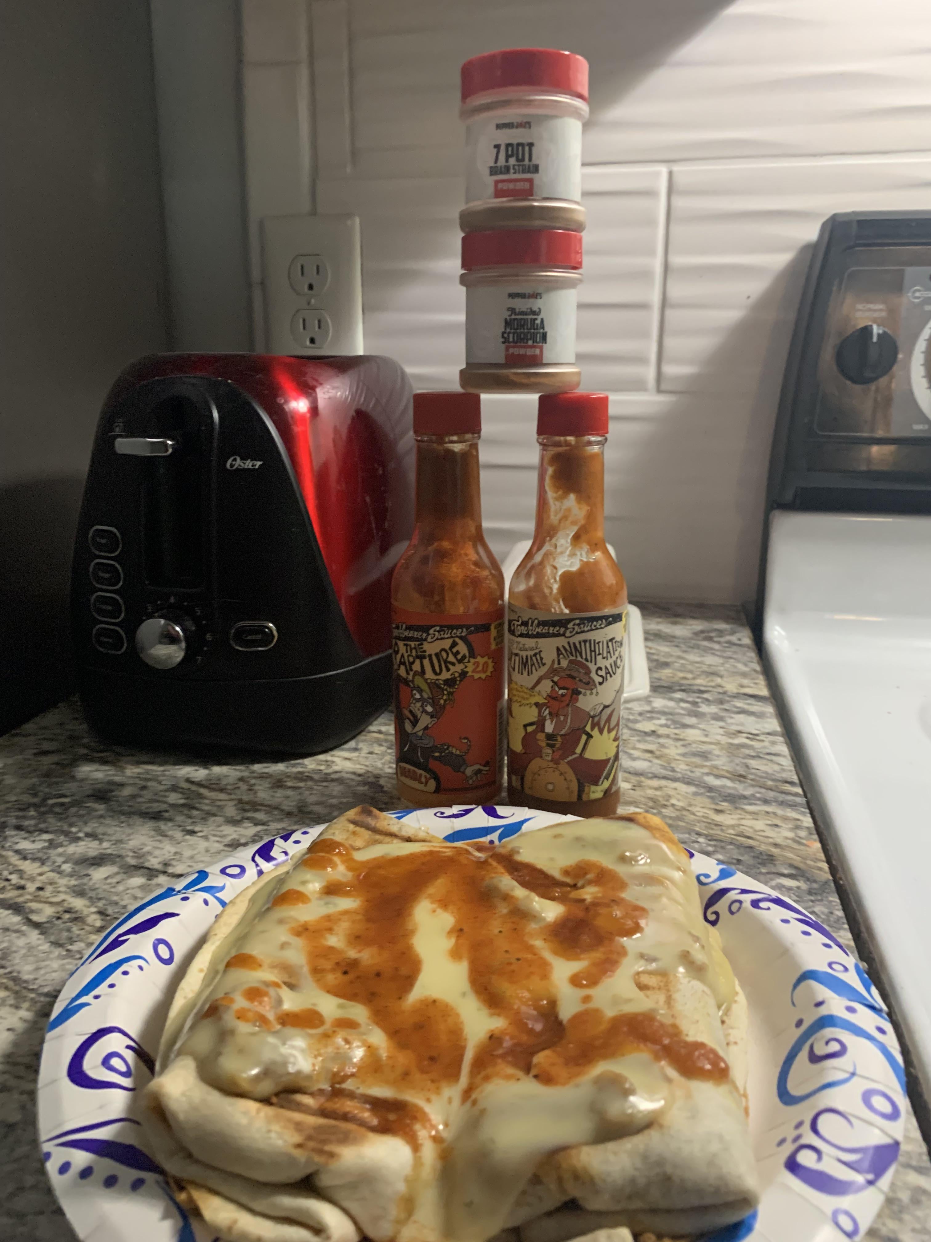 Two cheesy double beef burritos topped with jalapeño queso mixed with a healthy amount of 7 Pot and Moruga Scorpion pepper powder topped with a helping of some of my favorite hot sauces. Delicious. by AcidActually Spicyspicy foodspicy recipesWrite A CommentYou must be logged in to post a comment.