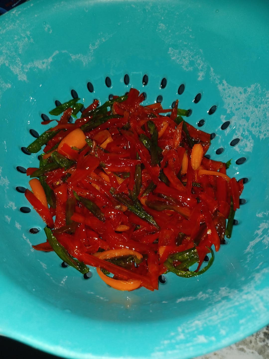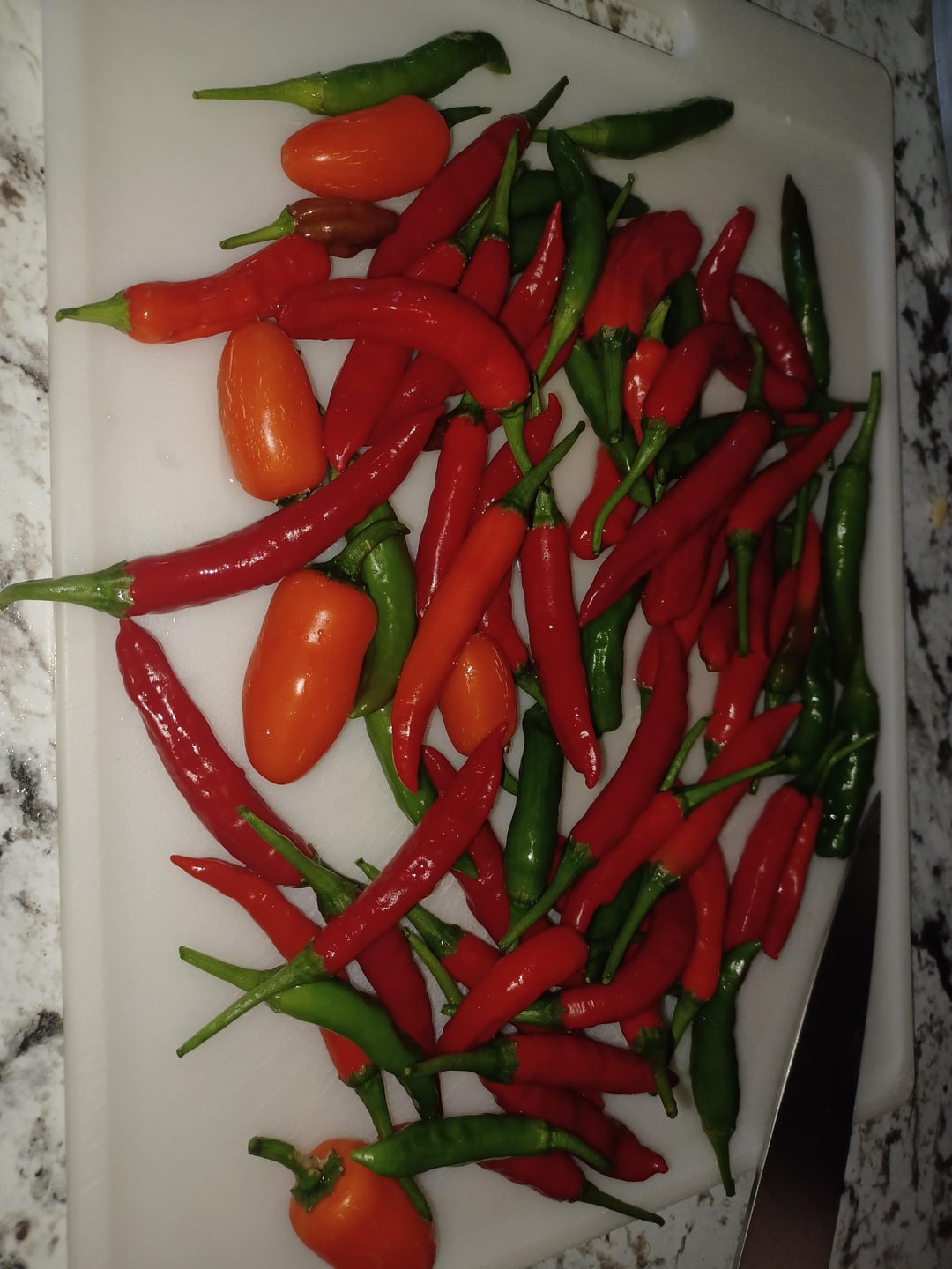 I used Orange Jalapeños, Cayennes and Shishitos for this batch. I prefer ripened peppers best but my family prefers the green ones, so I harvest when there's about a 70 to 30 mix of ripe to green.
