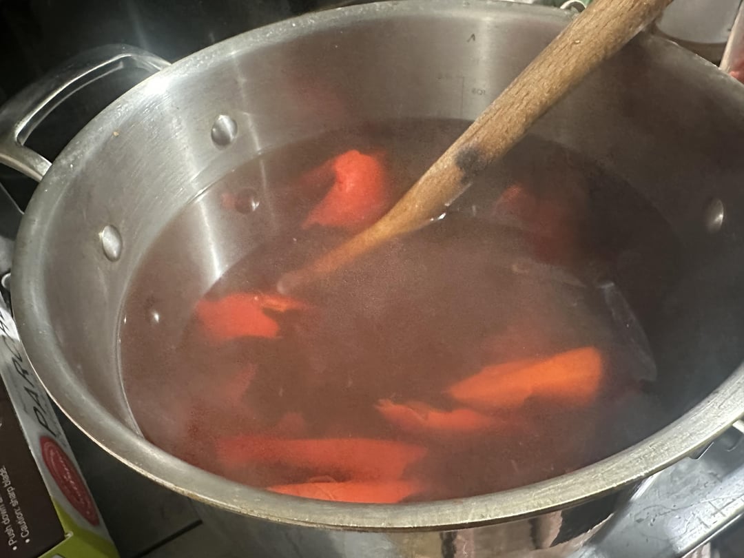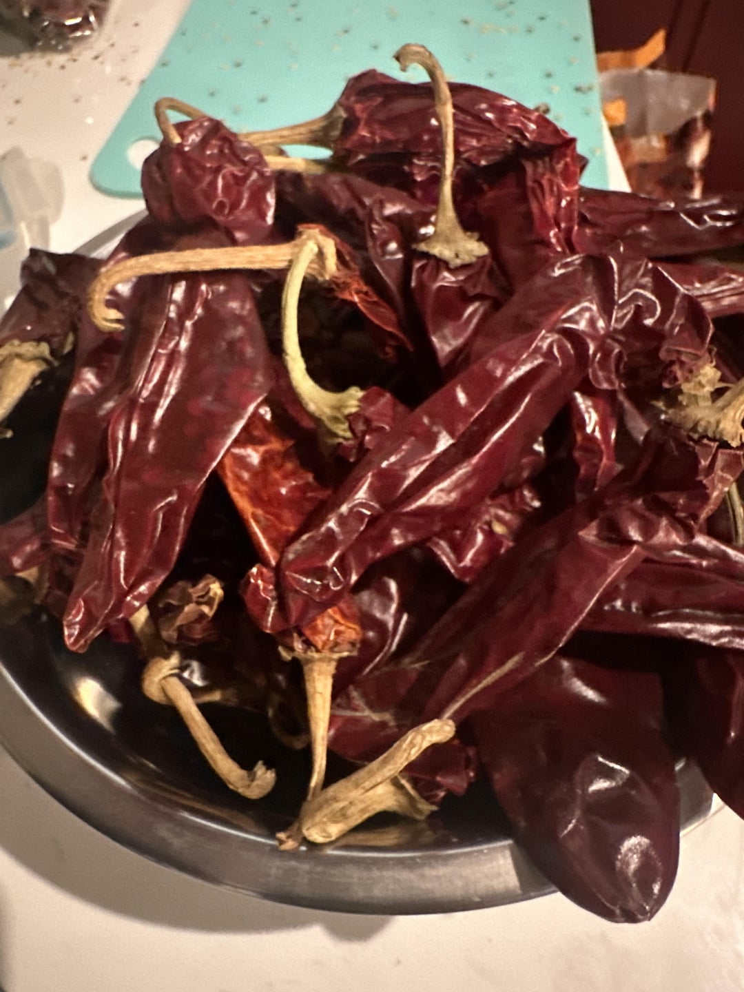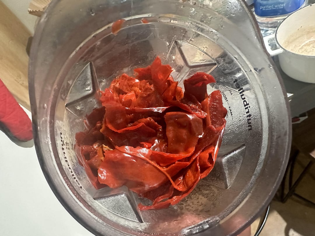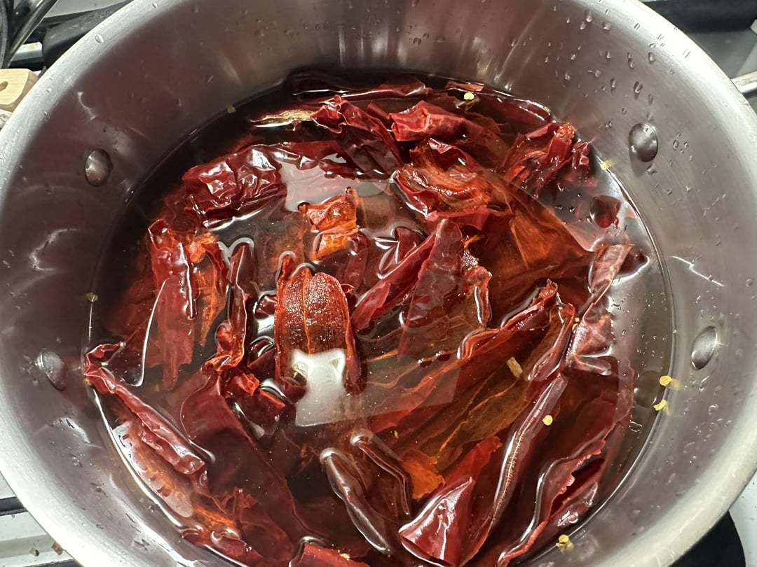 Lazily seed and stem a package of dried guajillo peppers. Simmer them for about an hour.