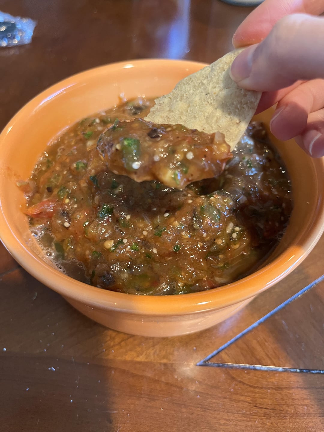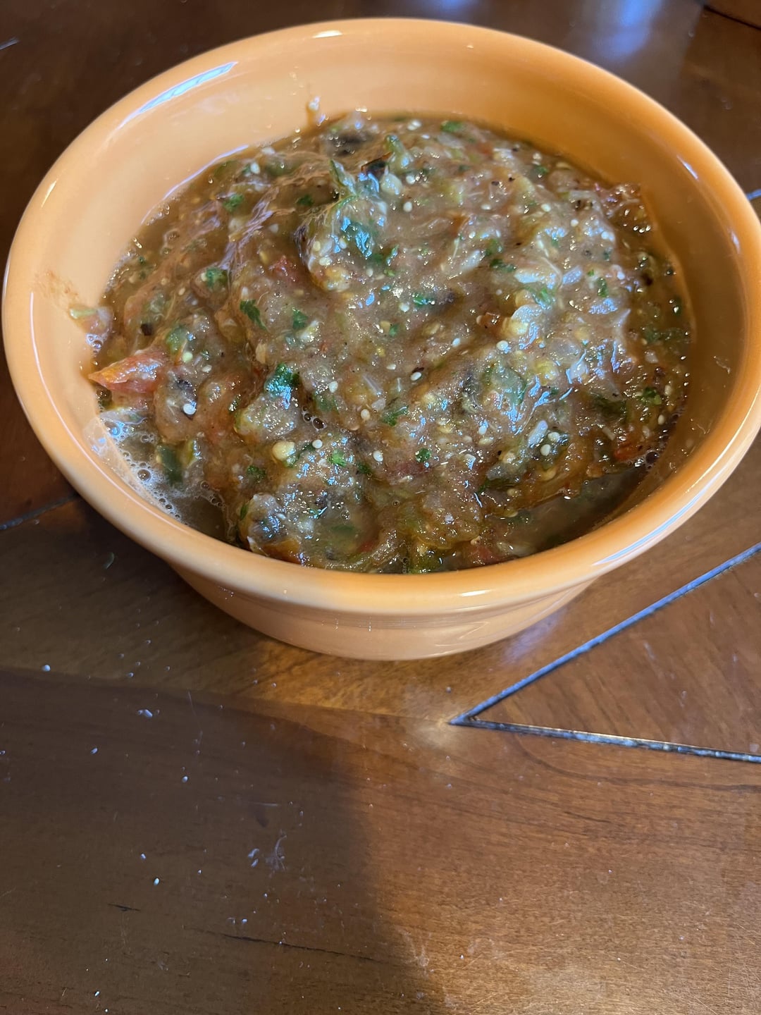 8 roma tomatoes, 3 very small yellow onions, 2 huge garlic cloves, a poblano, a jalapeño, a few springs of cilantro, all from the farmers market, plus 6 tomatillos, juice of a lime, and rehydrated chilis de árbol from the supermarket. Everything but the cilantro and limes was roasted and broiled before being blended up (and salted, of course). Heat starts off mild, but builds.