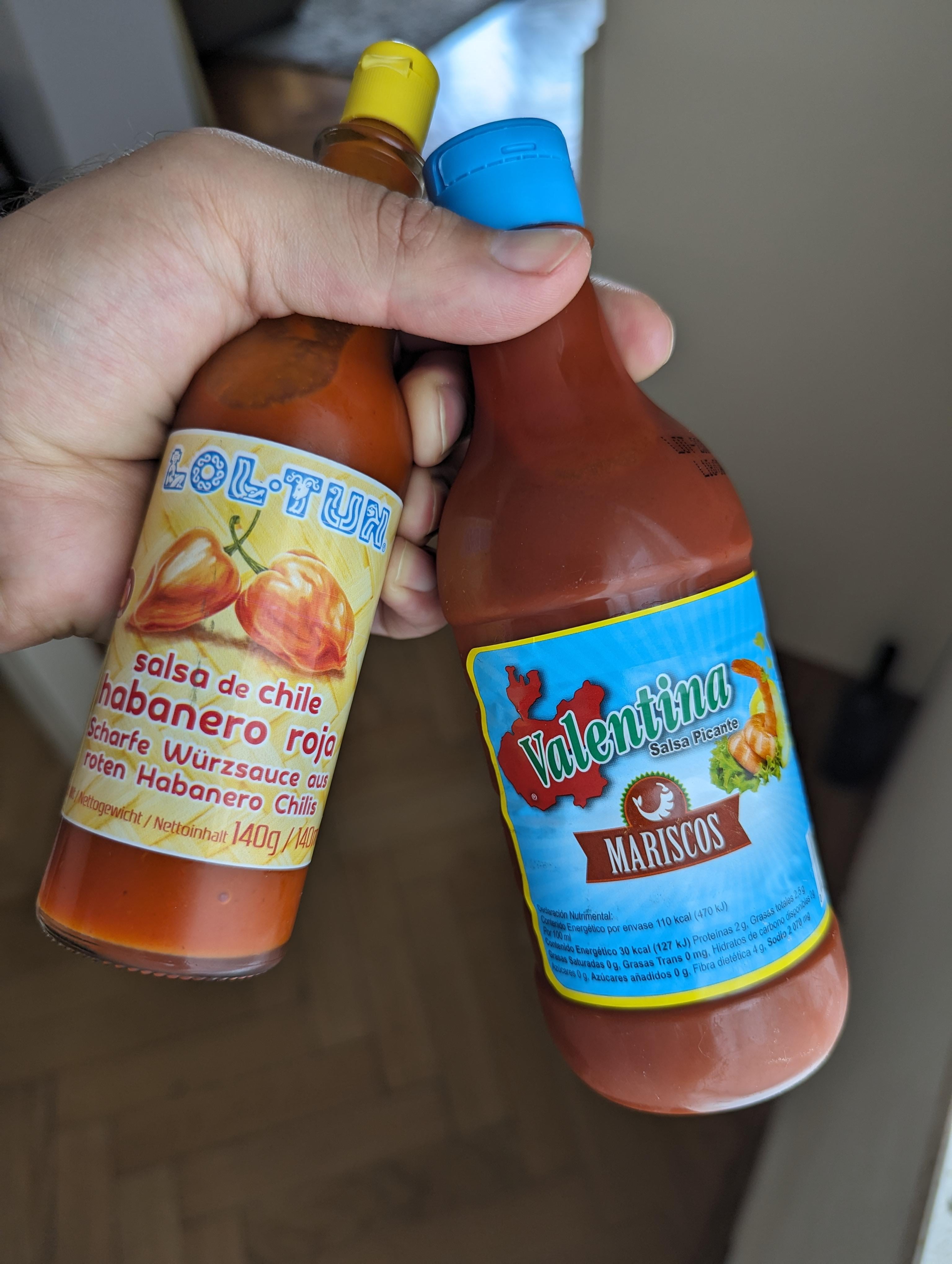 Both great hot sauces. Trying Valentina mariscos for the first time now. I think I prefer this version of it, although it's very similar. The consistency is thicker and maybe a tad more citrusy. It's a bit spicier too which is great.