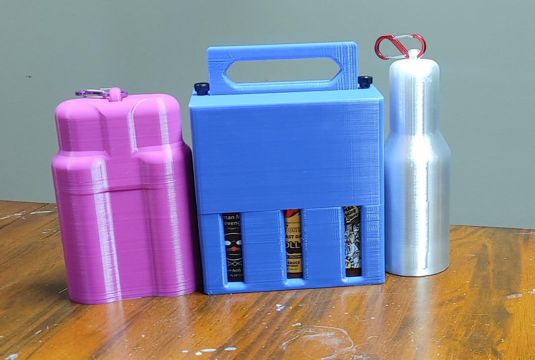 My hot sauce travel carriers that I designed and 3d printed. Made a 6 pack with thumb screws to lock the lid down for travel, has a place to store the thumbscrews on the side of the lid. Made a single pack and double pack with an carabiner locking system for travel and easy storage/removal.