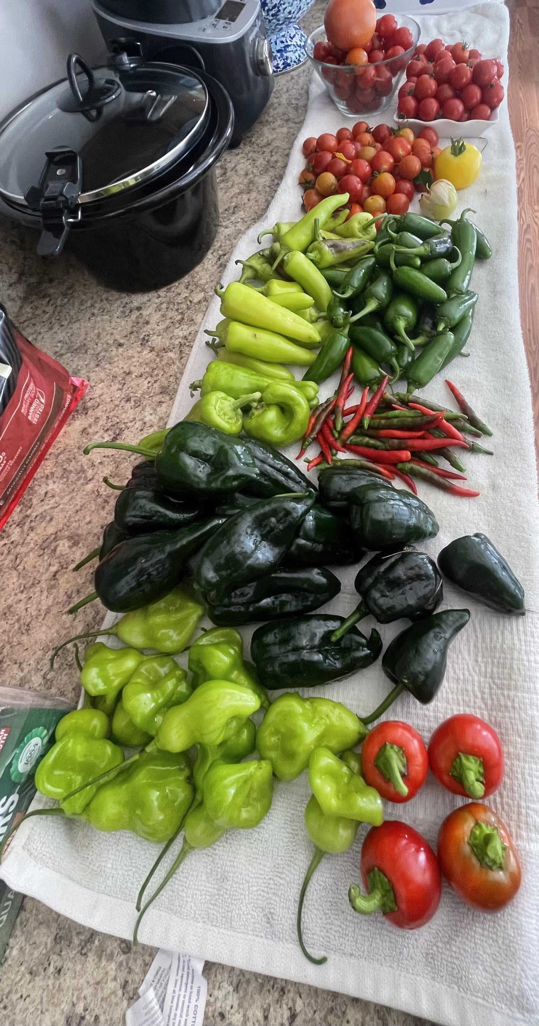 We took a few days off from harvesting and this was the result. Feeling a lot of gratitude for good soil, sunshine and water making something beautiful happen in our little garden. capperino, mad hatter, poblano, hot wax, banana, hot banana, jalapeno, cubanelle, tomatoes, one tomatillo and not 100% on the small red Thai looking chilies ( very hot btw).
