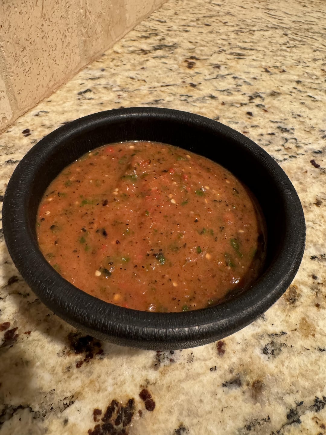 Broil/roast oil and salt coated onion/garlic/tomatoes together until lots of blackening. Add all ingredients to a blender and blend. Add water if too thick.