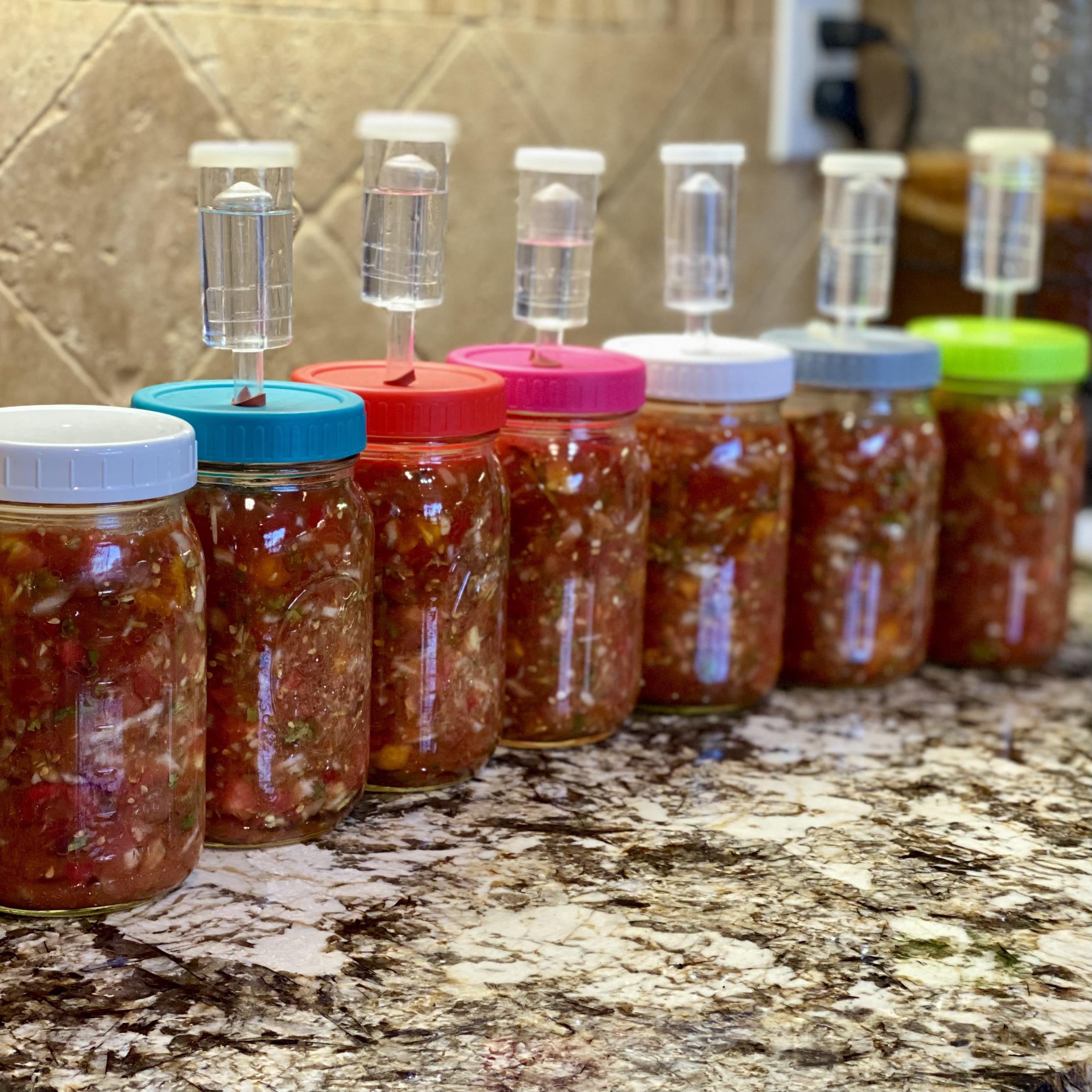Very basic recipe, just tomatoes, onions, garlic, jalapeños, cilantro, lime juice, cumin, paprika, salt and vinegar. Left to ferment for three days on the counter, then refrigerated!