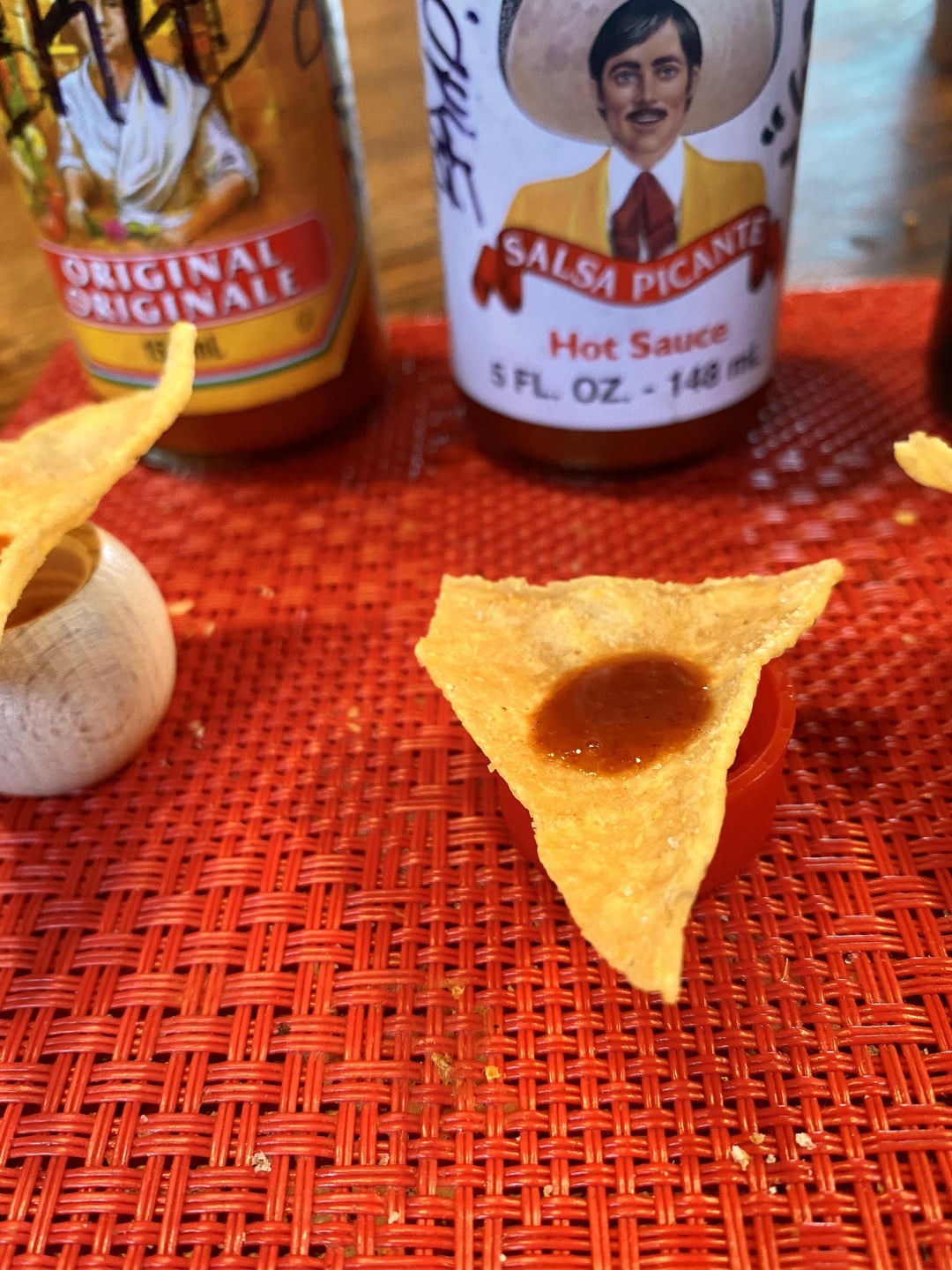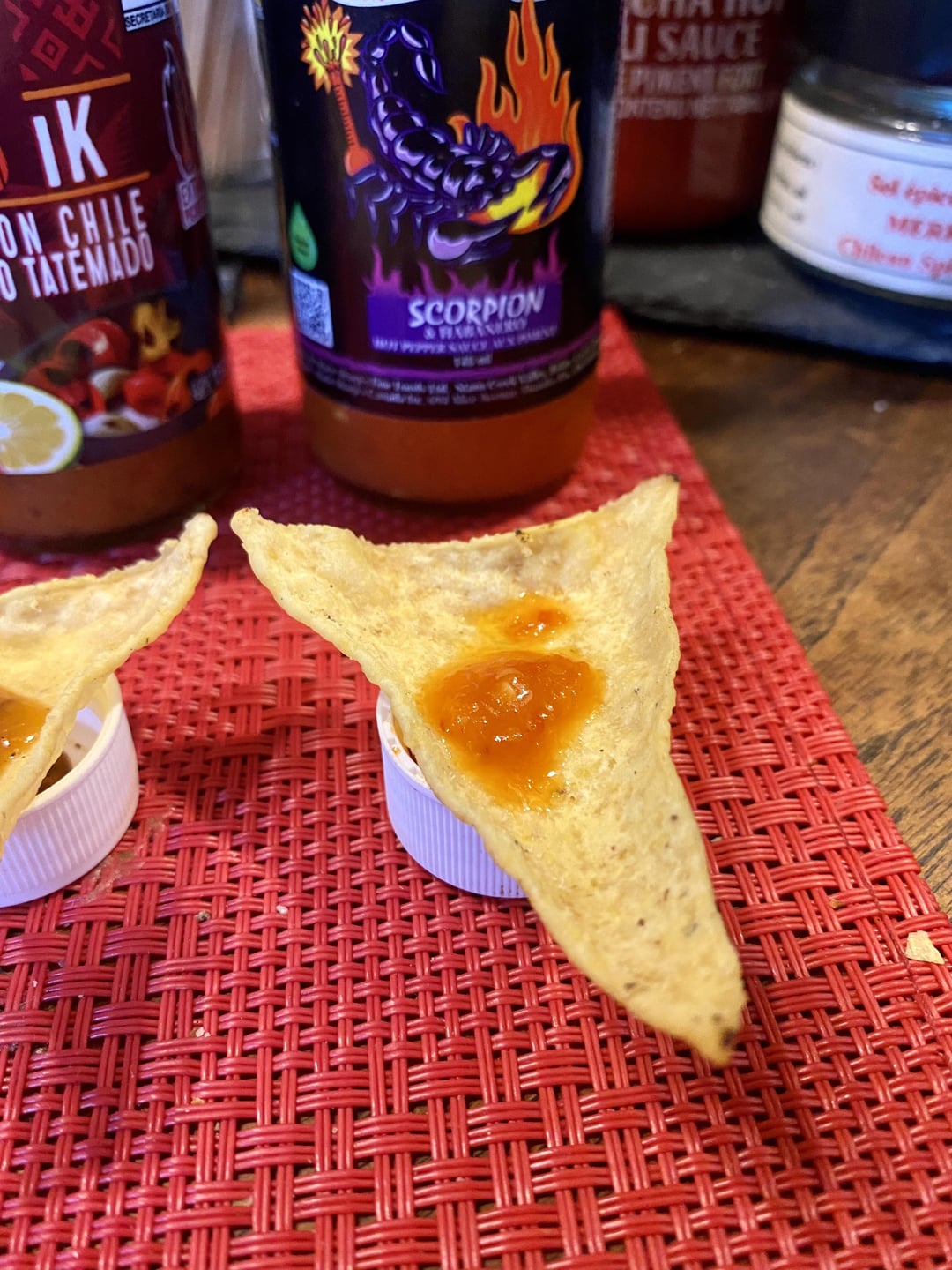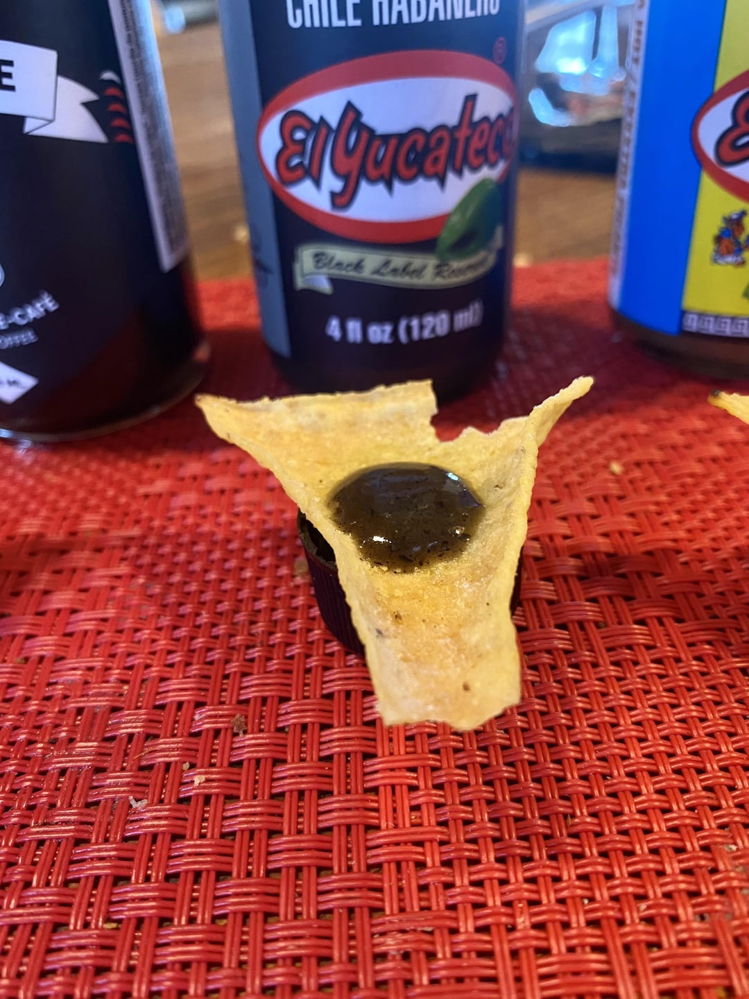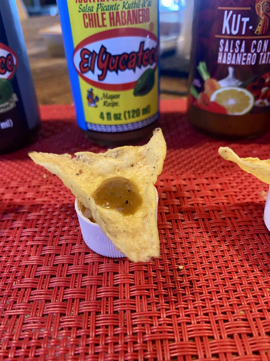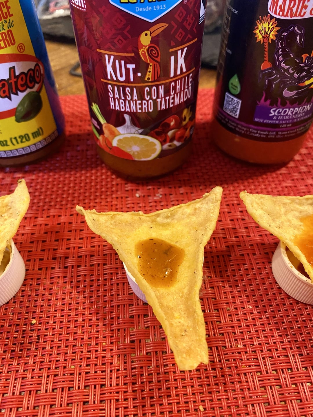 Method: one La Cocina tortilla chip. Equally sized 2-3 drops per chip.