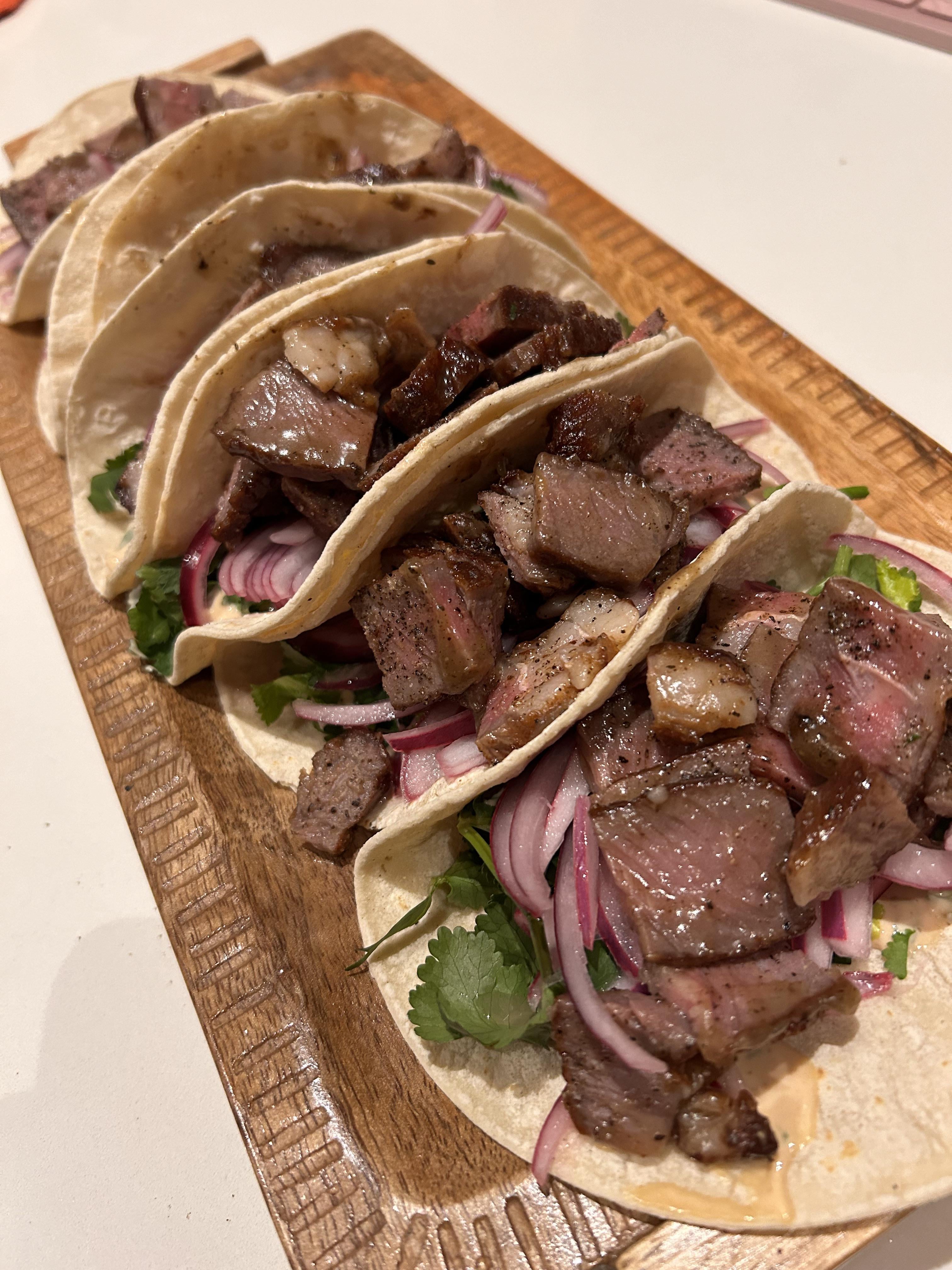 I like to do meat first, toppings on top. My favorite toppings are cilantro and onion, and I really prefer cilantro to be as cold and fresh as possible. I feel like meat over cilantro would make it warm and soggy. Not that there’s anything wrong with that, I just really prefer cool and crisp cilantro!
