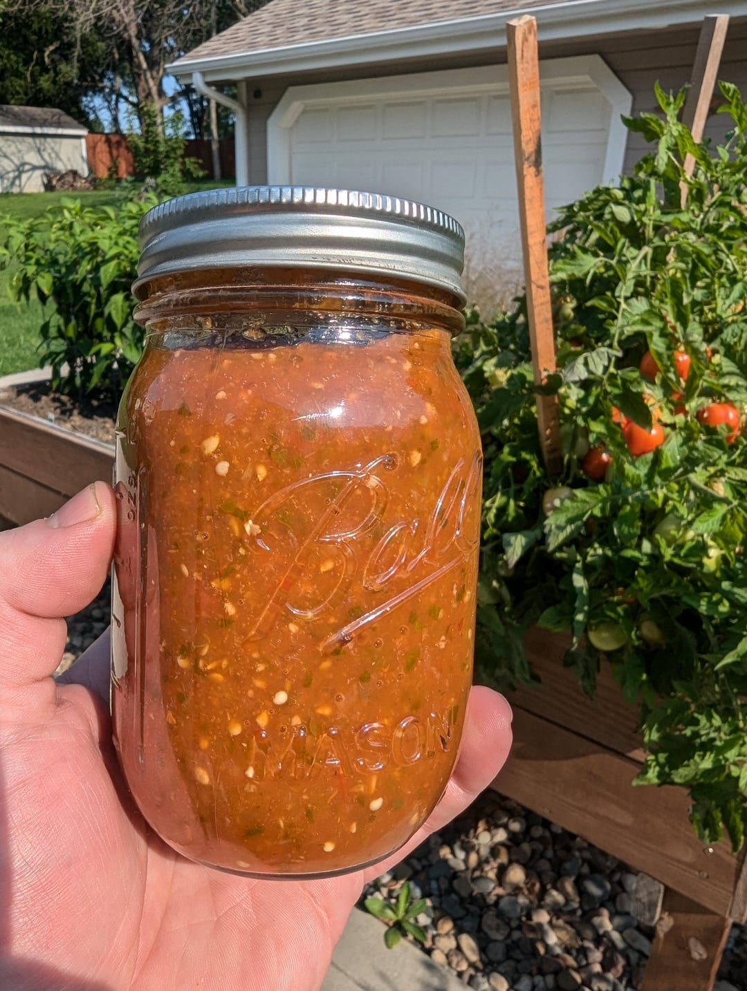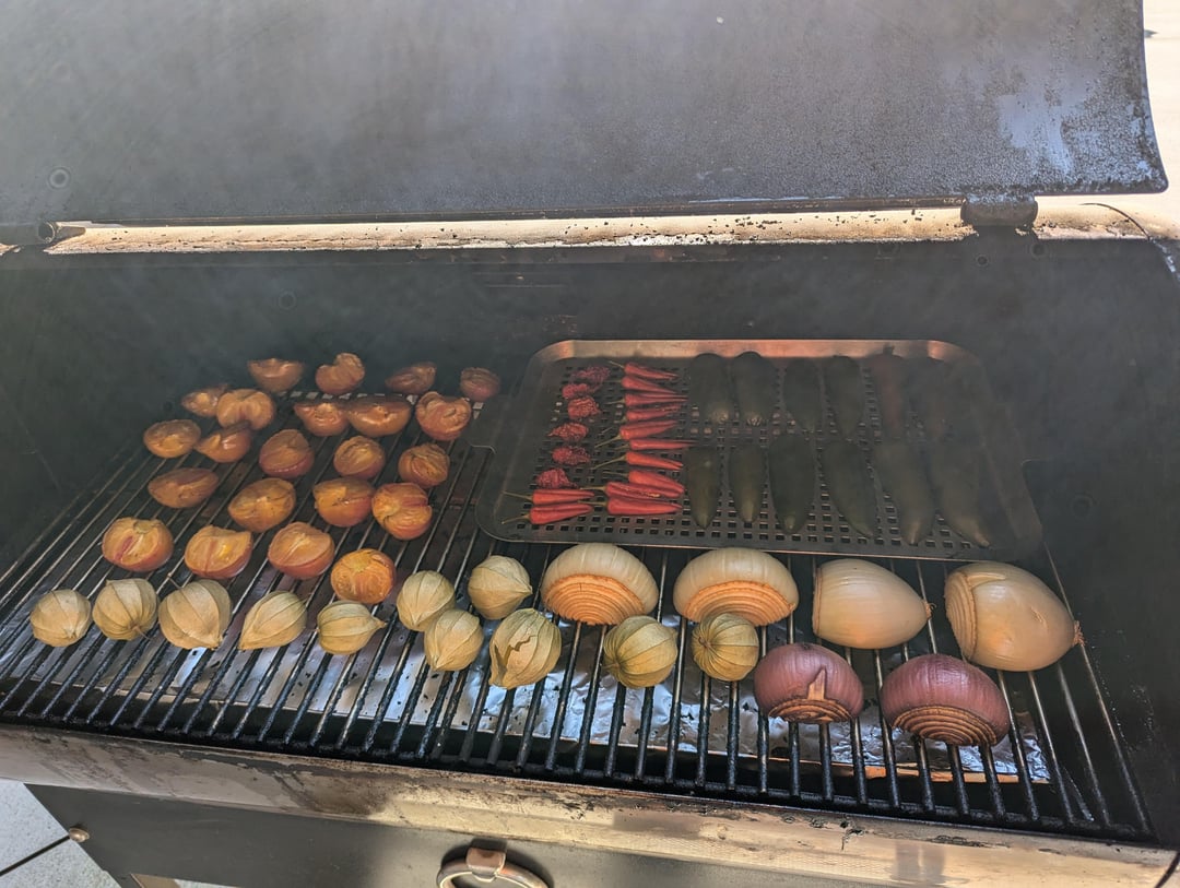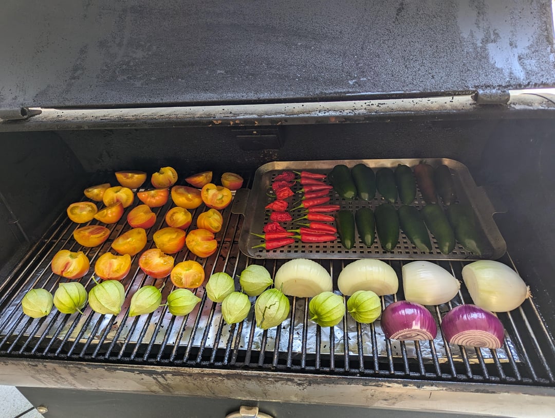 Decided to throw a little bit of everything from the garden on the smoker for about 3 hours. Added the smoked ingredients to about 6 lbs of stewed Romas, 2/3 cup of apple cider vinegar, some spices and blended thoroughly. A perfect balance of smoke, heat, and flavor! 🍅🌶️🔥