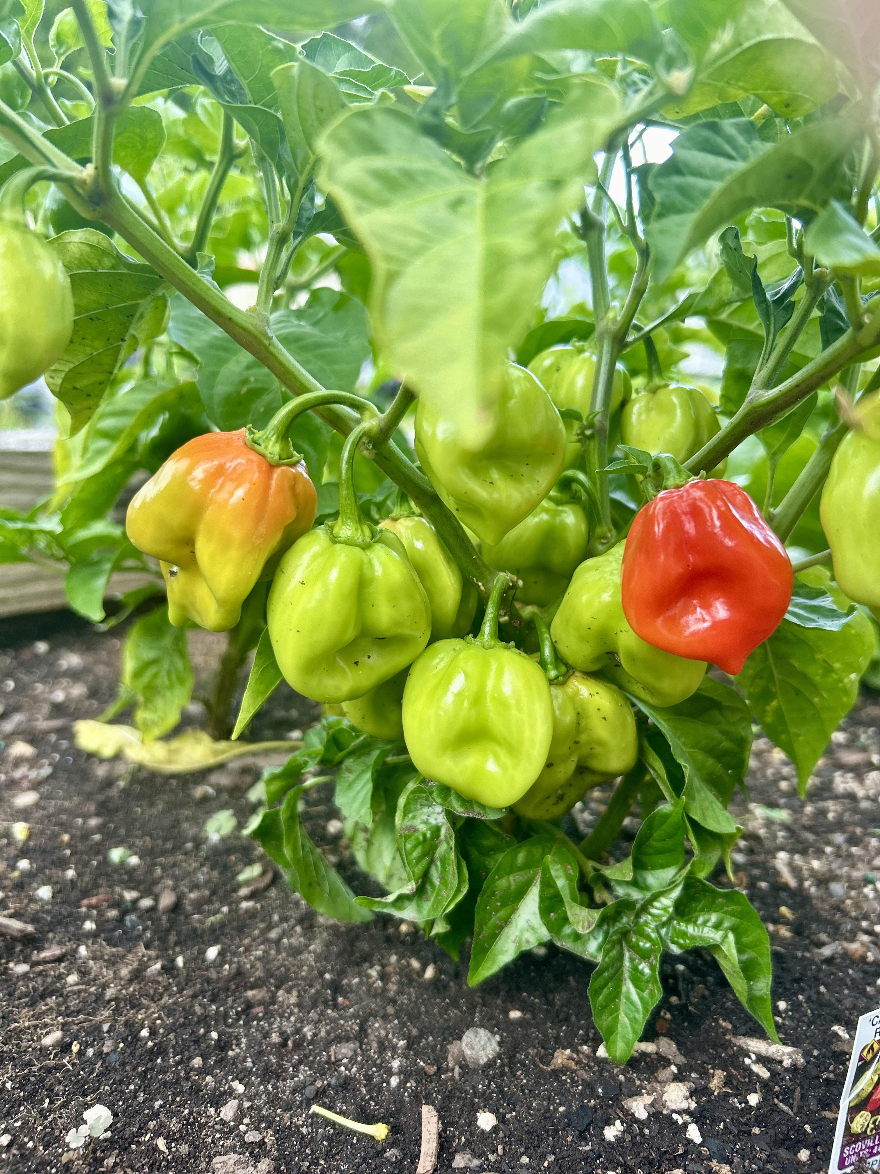 New to growing peppers. Got some Caribbean Red seedlings and planted them in what I thought was a good spot. This is how they look today. When can I harvest for maximum flavor? That one just turned completely red. Thanks and happy growing!