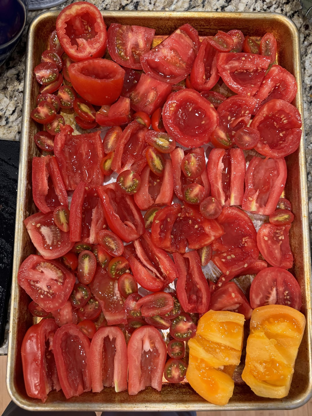 Lots of garden tomatoes roasted (with the seeds removed)