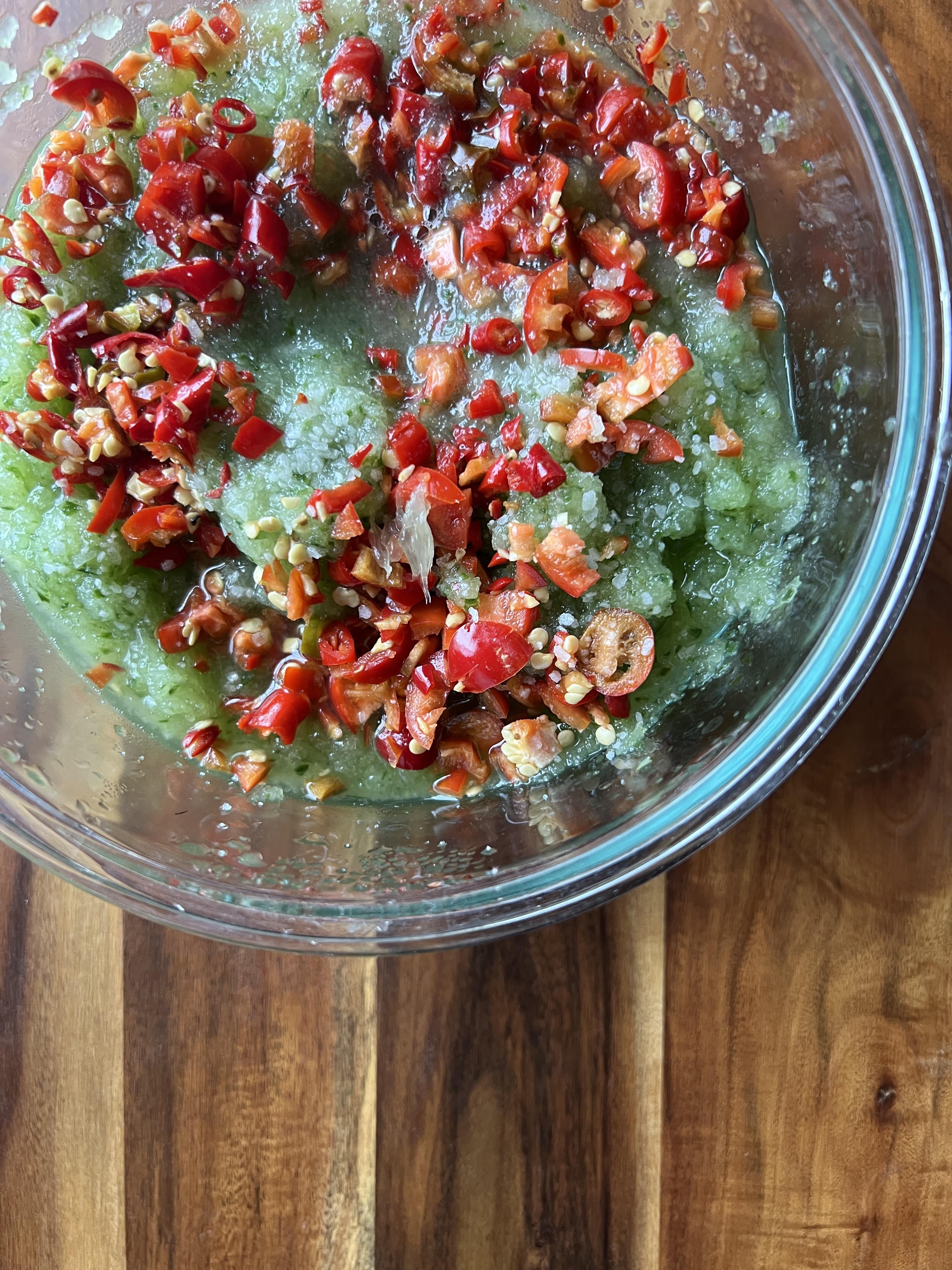 A “salsa” made from left over cucumber pulp from an agua fresca, ripe jalapenos, chile de arbol, lime juice and salt. Cucumbers and peppers from my garden. So far it’s delicious – it’ll be better after a couple hours in the fridge.