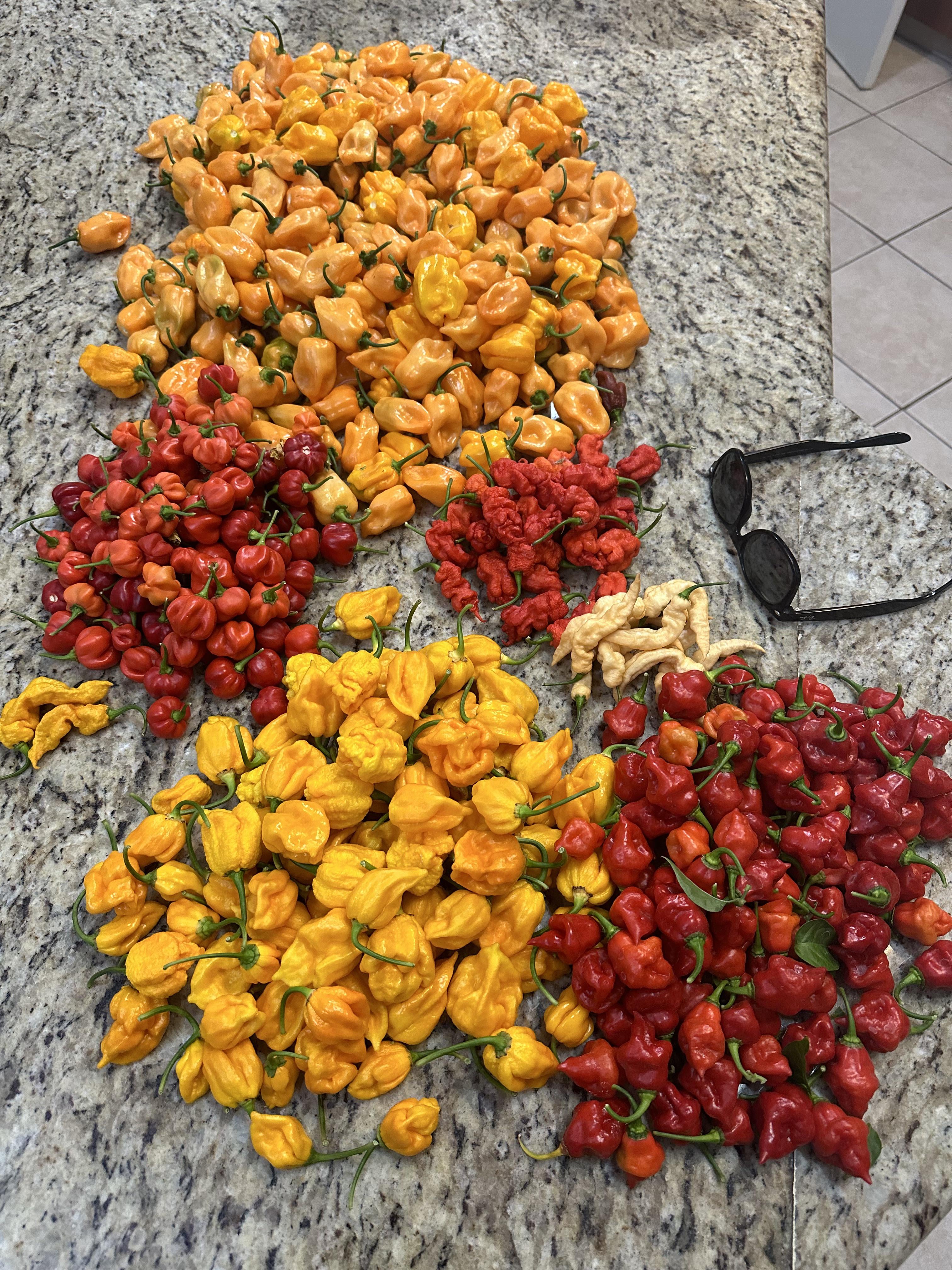 Habanero, scotch bonnet, reaper peach, jays ghost scorpion, yellow reaper, peach reaper x, and “where’s the heat?” Pepper that is supposed to be a heatless habanero but is as or more hot than a habanero. Tomorrow is ferment start day.