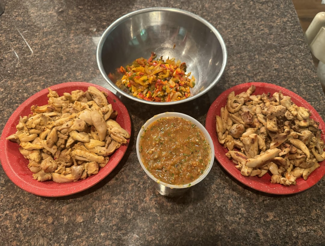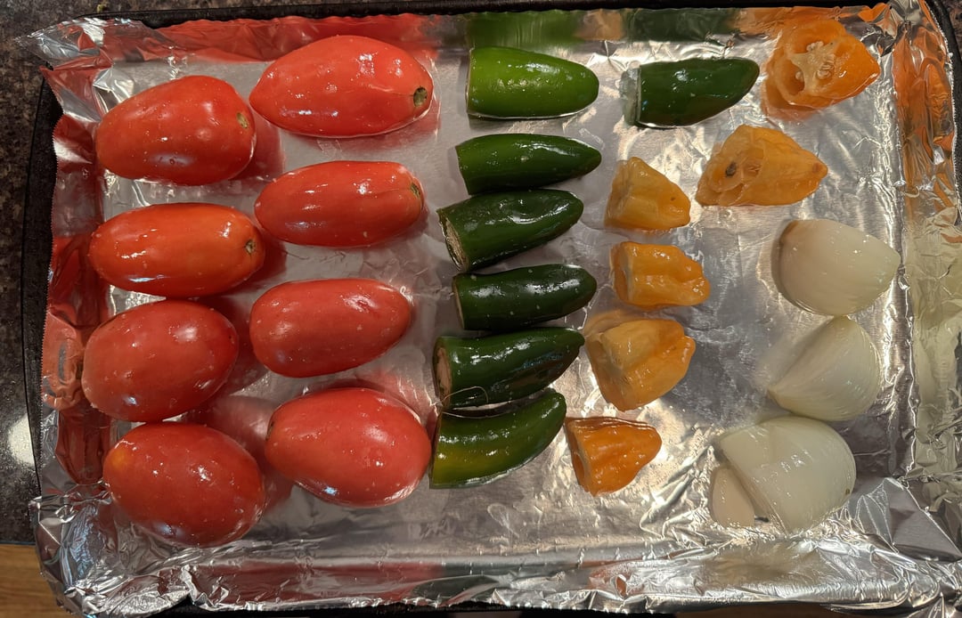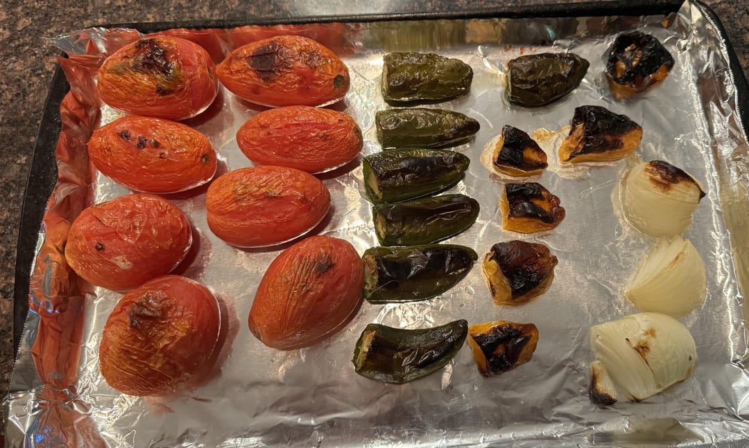 Tomatoes, peppers, and onion were coated lightly in avocado oil and salt, and put under the broiler for 40 minutes.