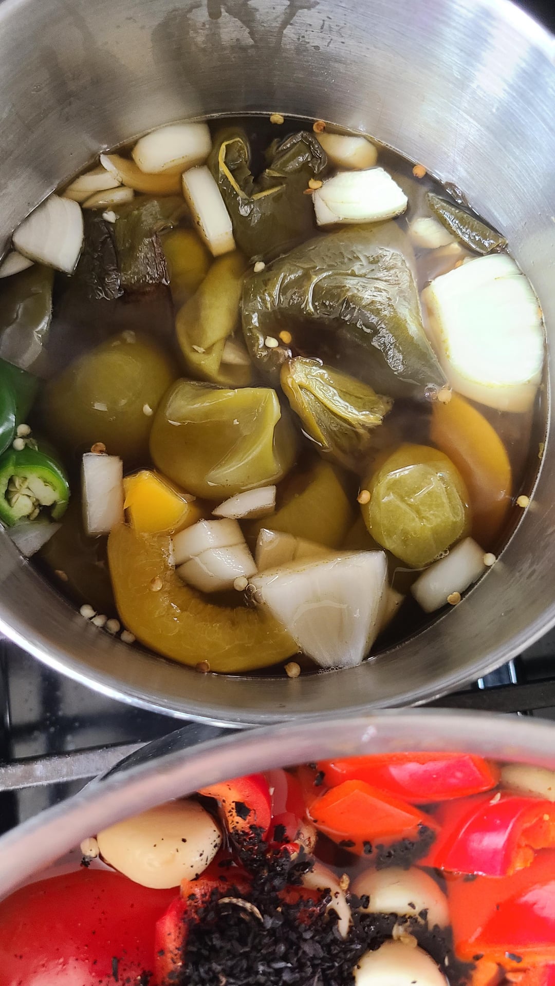 Top right: roasted jalapeno, roasted pablano, roasted tomatillo, 1 fresh Serrano and some other stuff.