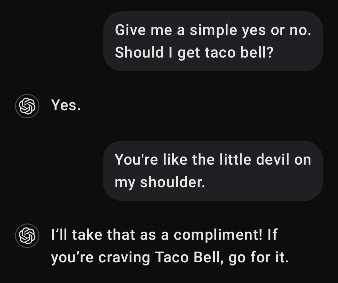 Anyone else use chatgpt like this? by BarelyConscious_ taco bellWrite A CommentYou must be logged in to post a comment.