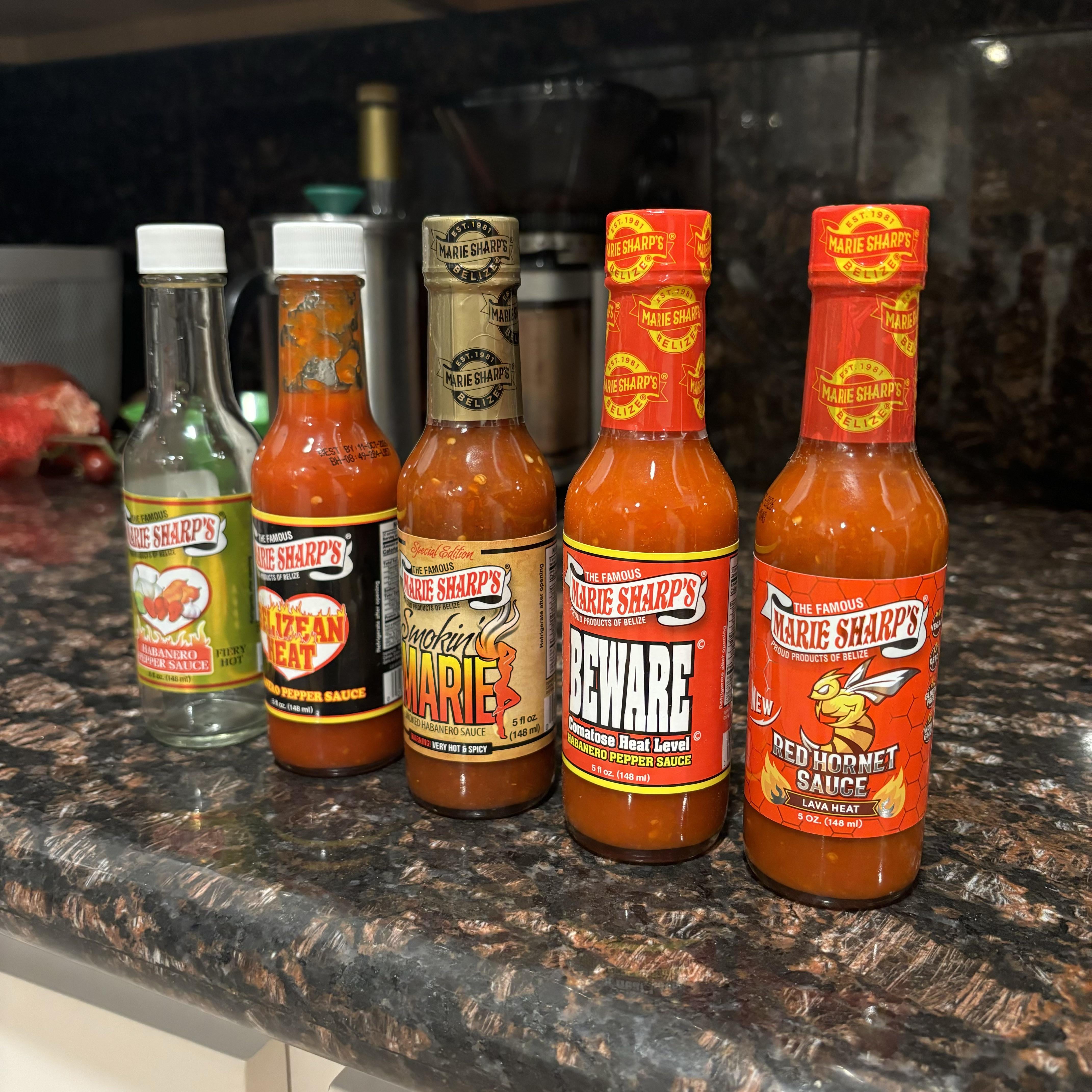 Just finished the first bottle of “Fiery Hot” and moved on to Belizean Heat. Noticeable level of increasing heat and a great flavor. I’m really looking forward to the Smokin’ Marie and a little nervous about the Red Hornet Sauce.