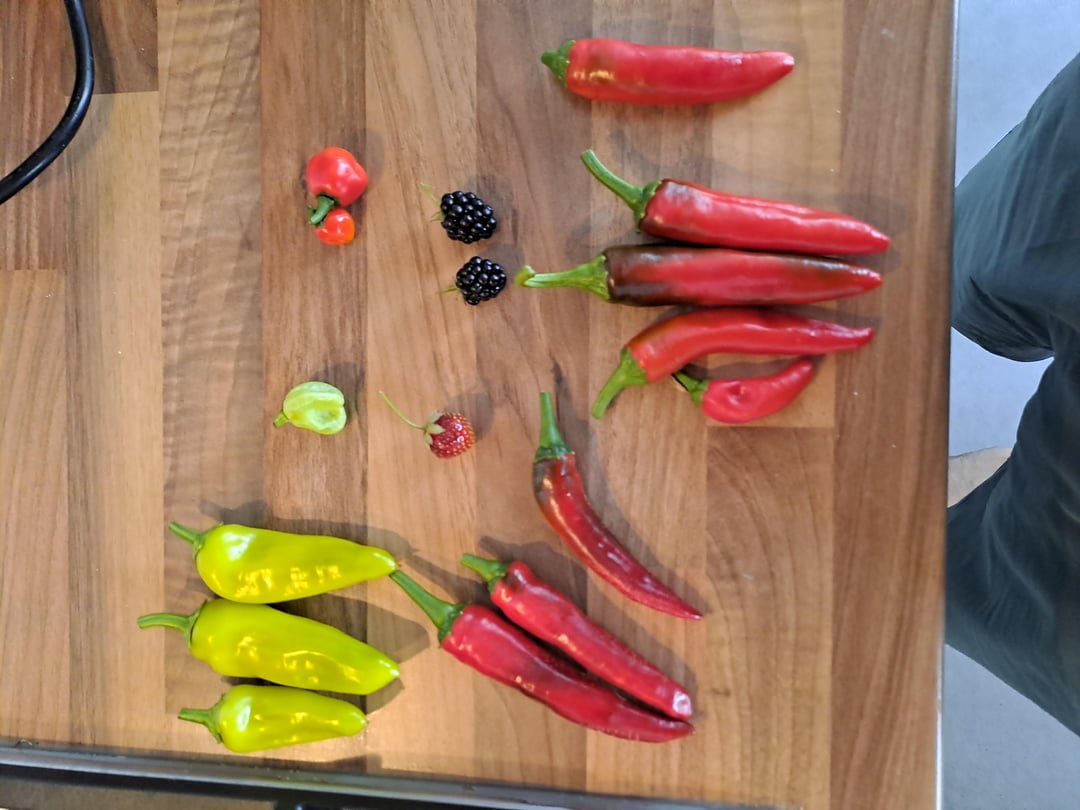 Shown are jalapenos, cayennes, Hungarian hot wax, white habanero and 2 small bonnets. And some lost fruits…