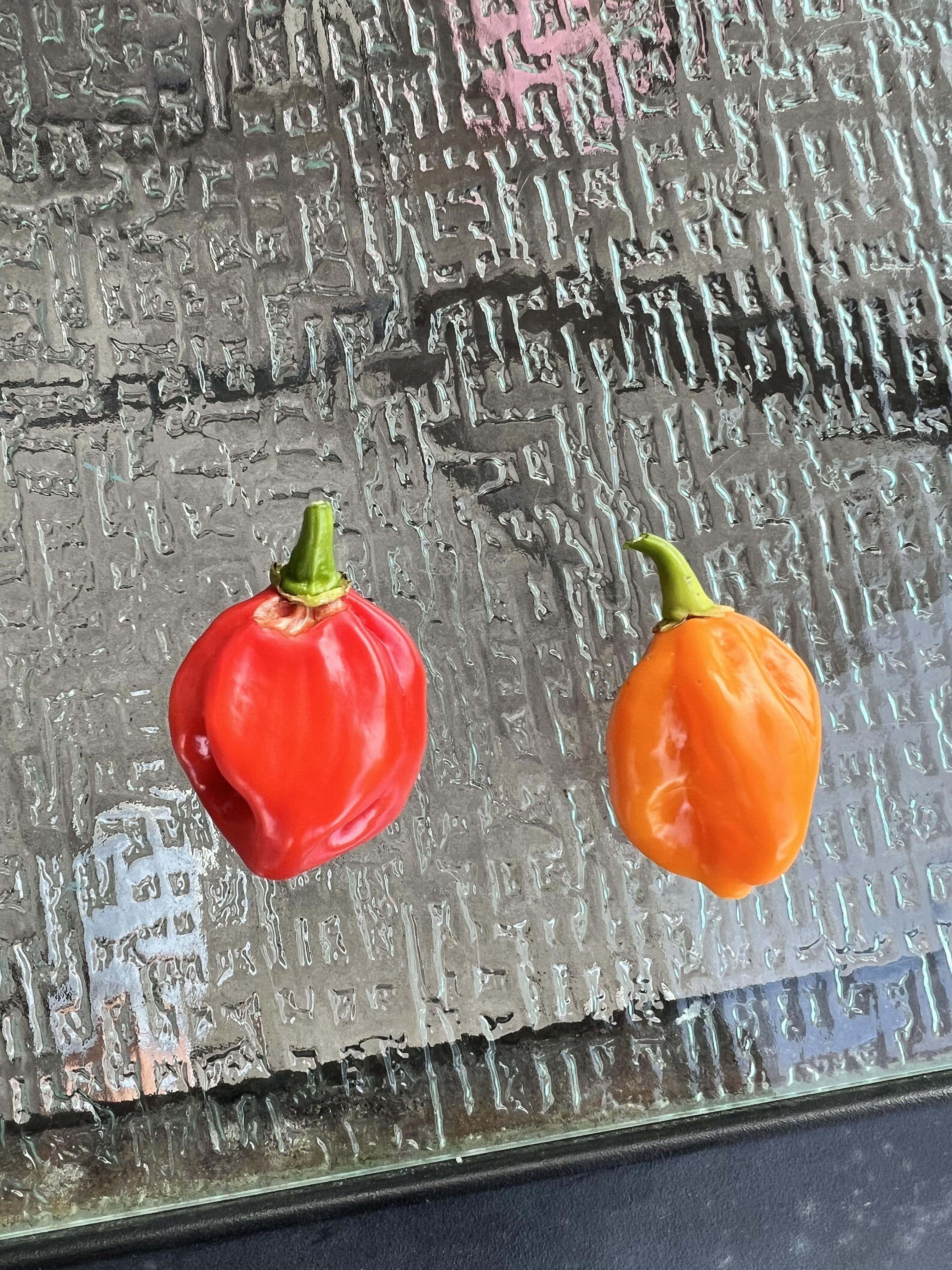 I planted ONE habanero strain this year – Caribbean Red. Ripens from green to the lovely deep crimson. But I have 2 plants that are giving me.. orange? It’s not an accidental cross because the plants are in different places, surrounded by other pepper types.. so what is it?
