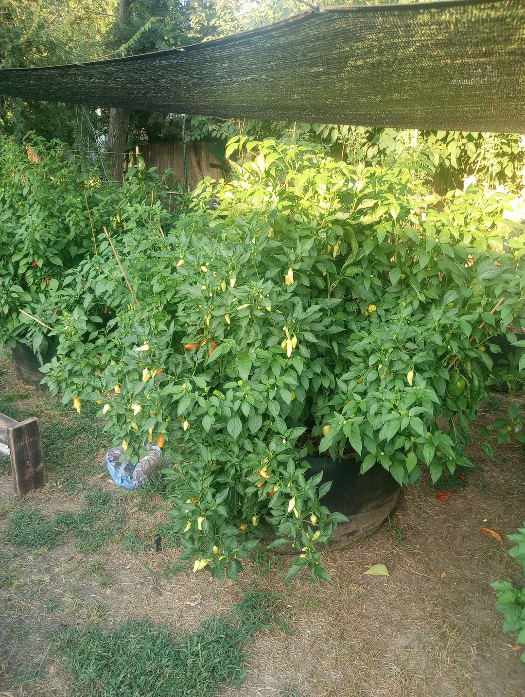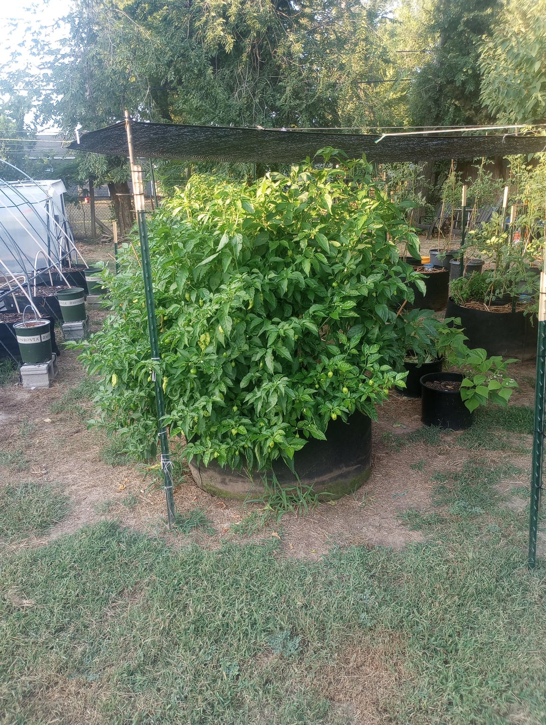 This year I put 15+ varieties per 100 gallon fabric pot and have loved the results. On super hot days (temps reach 110°F here) I'm watering every other day, but when it's more temperate I'm getting away with every 3-5 days. Although the per plant production is slightly lower due to their growth habit being more "one sided", not having to get out there twice a day JUST to water has been a game changer. I also put a shade cloth up mid-June that shades them from about 12pm-7pm, which here in central Oklahoma is hotter than hell. Like "oh my God what did I do to deserve this" level heat.