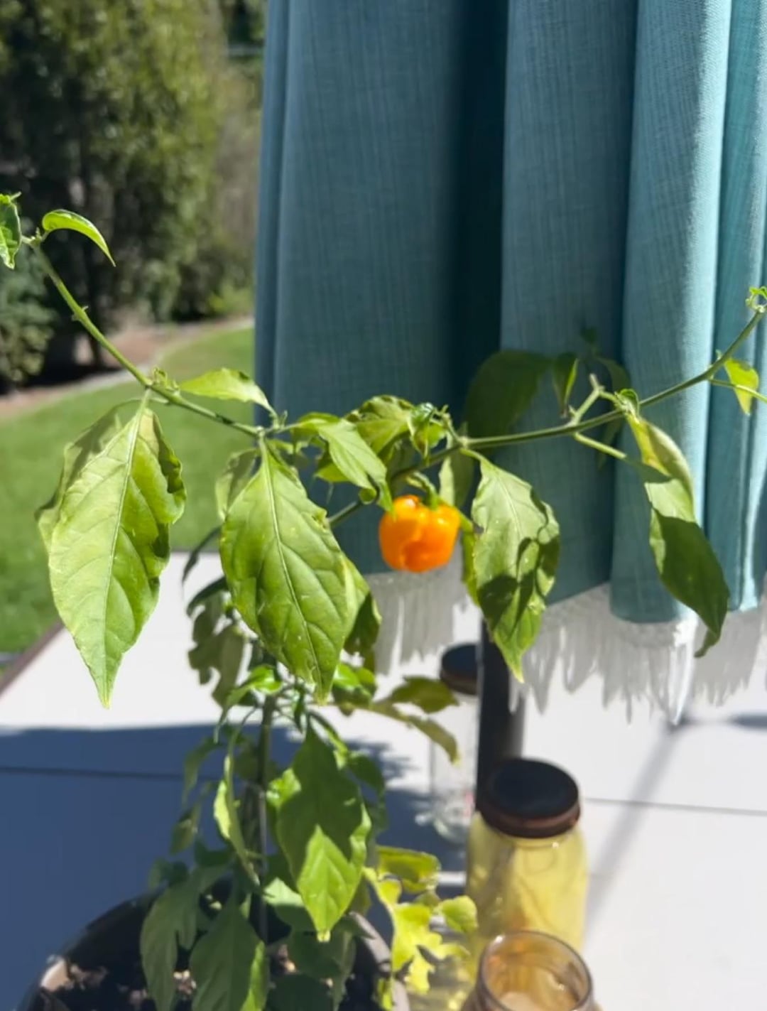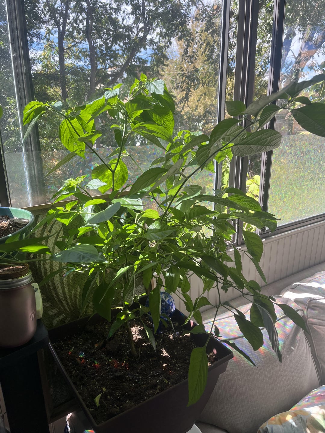 This habanero plant is in its second season and it has been growing very well. It is much larger and lusher than it was going into this spring/summer. Over the past week or so, the plant started to bloom for the first time this season, but only the side of the plant closest to the window is blooming. There aren’t very many flowers, maybe a dozen in total. I circled some in a close up photo because they’re hard to see. I’ve gently pollinated each flower by rubbing it with a q-tip, but most if not all of the flowers have started to die/fallen off. I’m not sure what I’m doing wrong, from what I’ve read the second year should be the most productive for these plants. I have still yet to see any peppers form. Last summer, it was so small it was like three twigs but it still produced one lonely pepper without me even manually pollinating it. I included the best pic I had of that too. Any advice/insight is much appreciated!