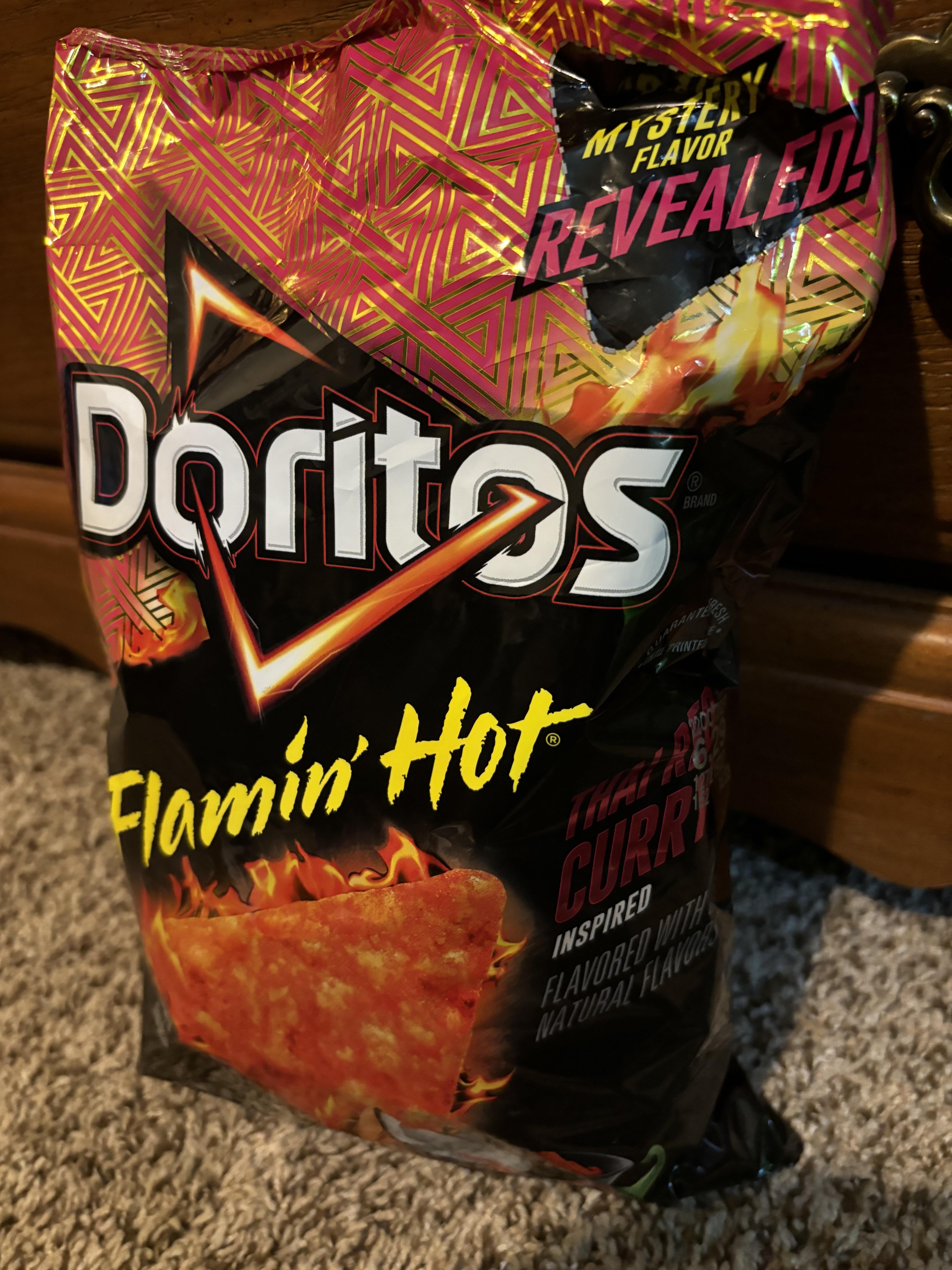 So Doritos came out with a Flamin Hot Thai Red Curry flavor. I’ve never had a Thai Restaurant Curry flavor that I can remember so I didn’t really know what to expect. They do have a little bit of spicy to them but they are also very sweet. There’s a little picture of a coconut on the front but I didn’t really expect that to affect them so much. Sweet/spicy is not my cup of tea, and if it’s not yours either I would steer clear.