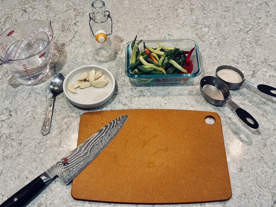 Boil chilies and garlic with water for 5 minutes. Then blend then boil with sugar,vinegar,salt and the rest of the water, chill then bottle.