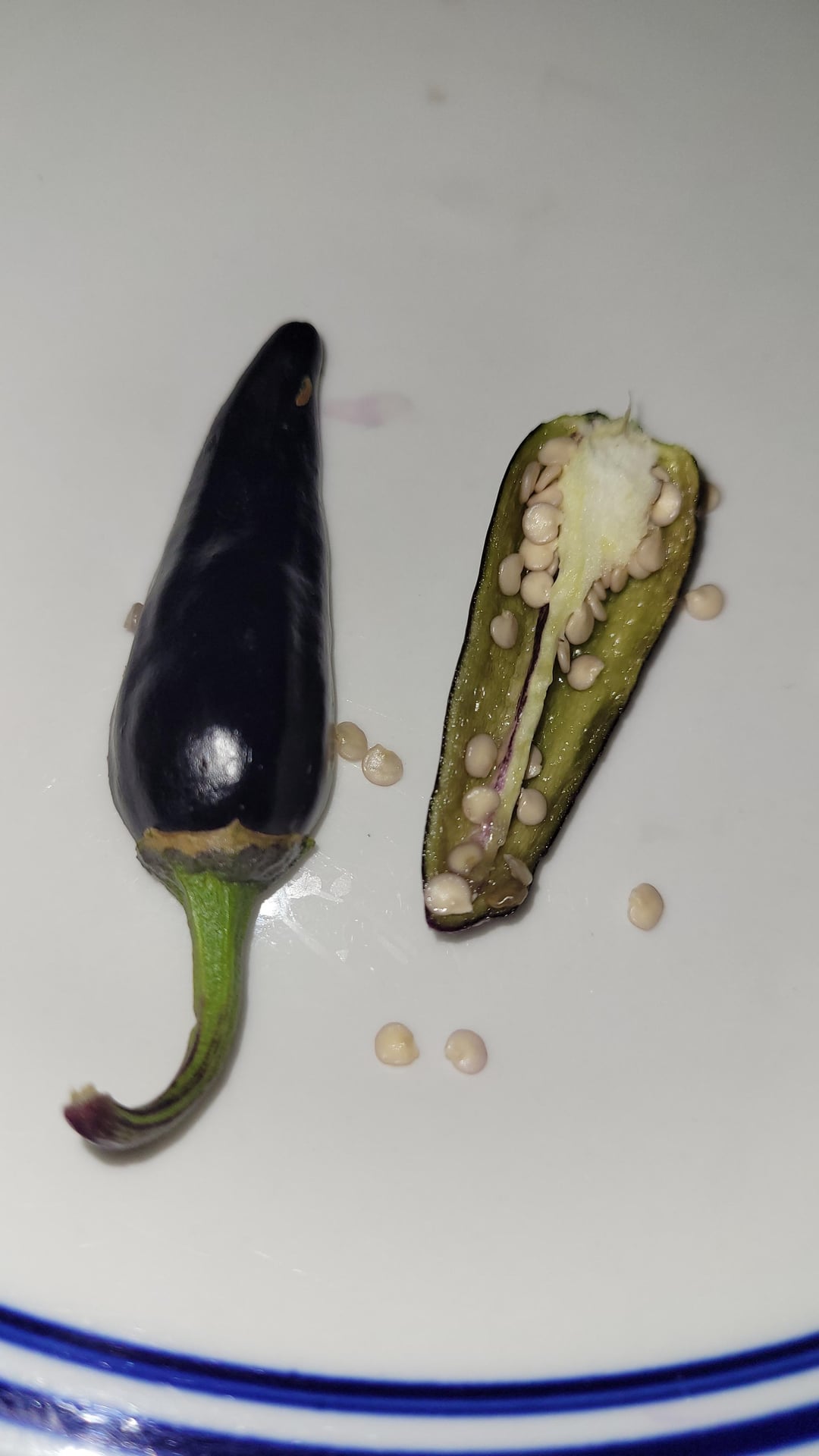 2nd Stage, Fresh (showing some red among the purple skin with red flesh): [Note: Some peppers will actually turn a chocolate color instead of red during this stage, and will later turn red. I'd say this happens to about 5% of the peppers]